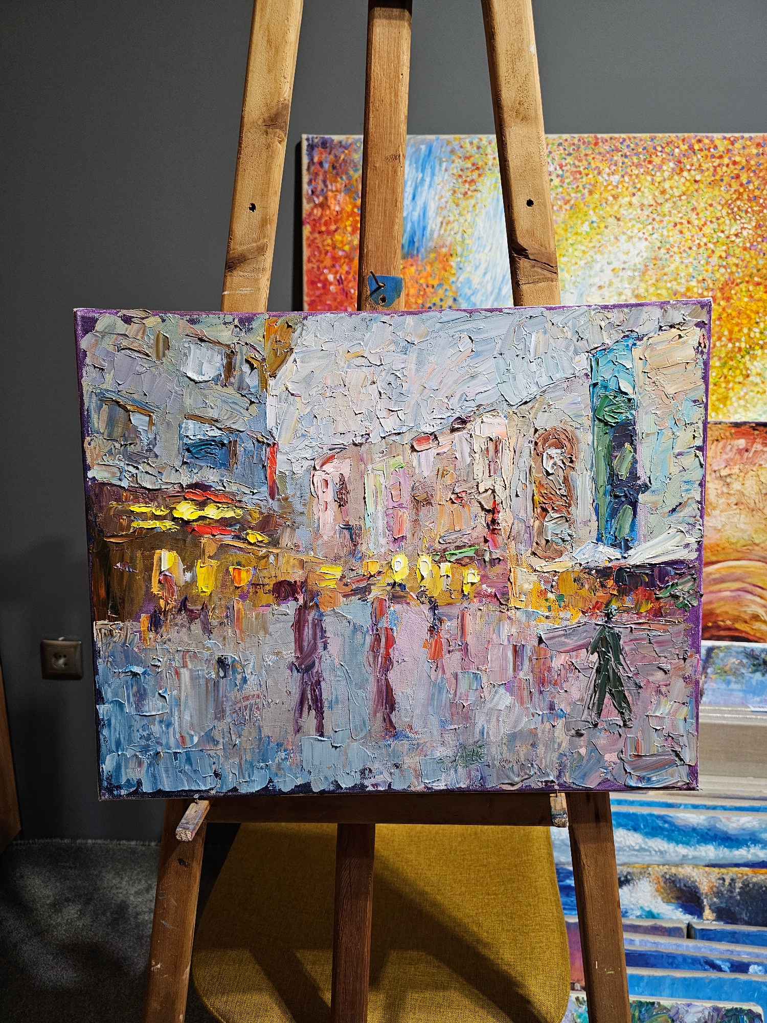 An eye-level indoor shot depicts an impressionistic painting of a street in Plovdiv, Bulgaria, rendered with thick, textured brushstrokes in a palette of blues, grays, purples, yellows, and oranges. T…read more