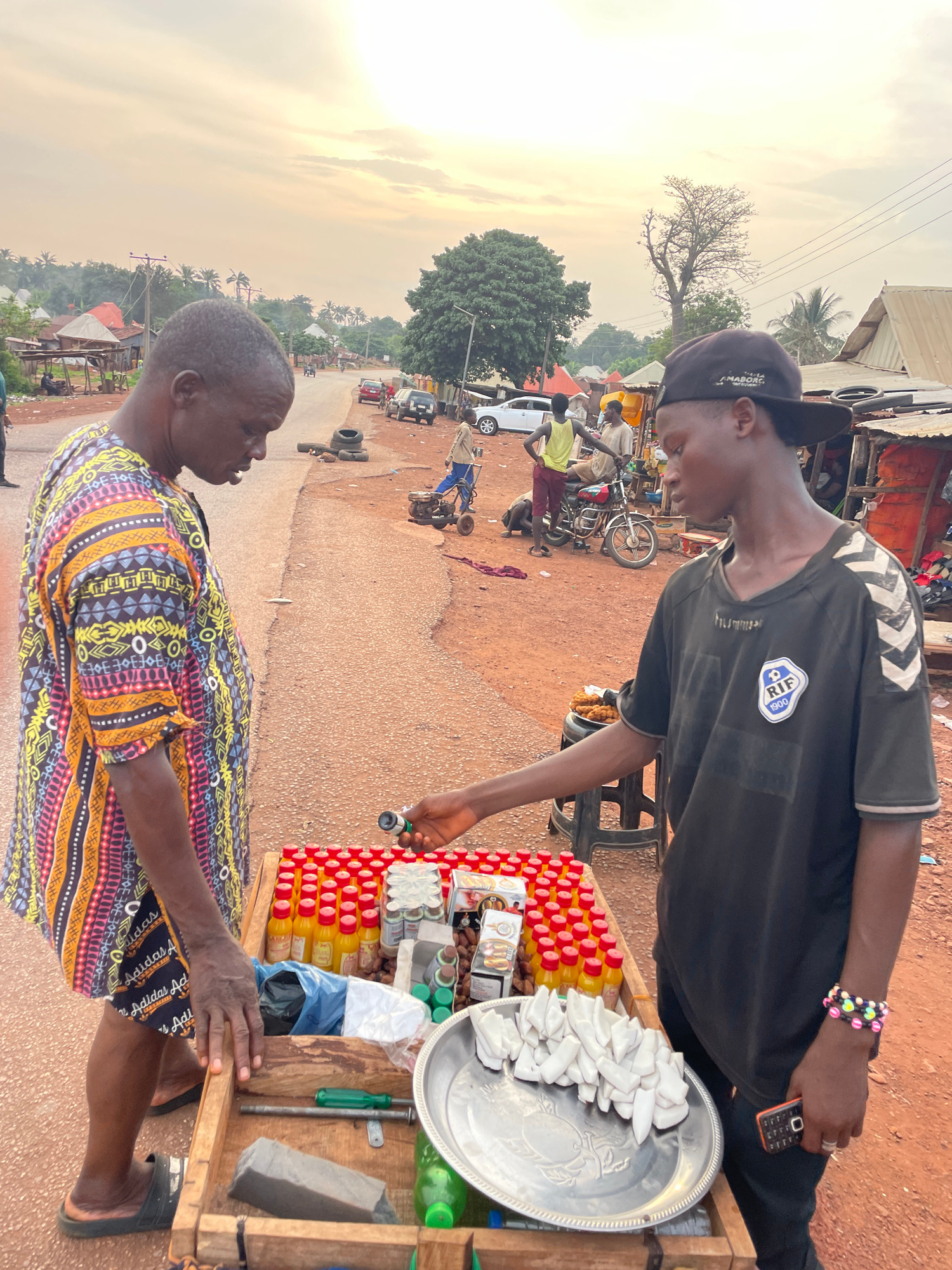 A street scene in Ogbe, Nigeria, shows two people engaged in a transaction at a roadside stall. A younger man with a black hat, black shirt, and a colorful beaded bracelet is handing a small vial to a…read more