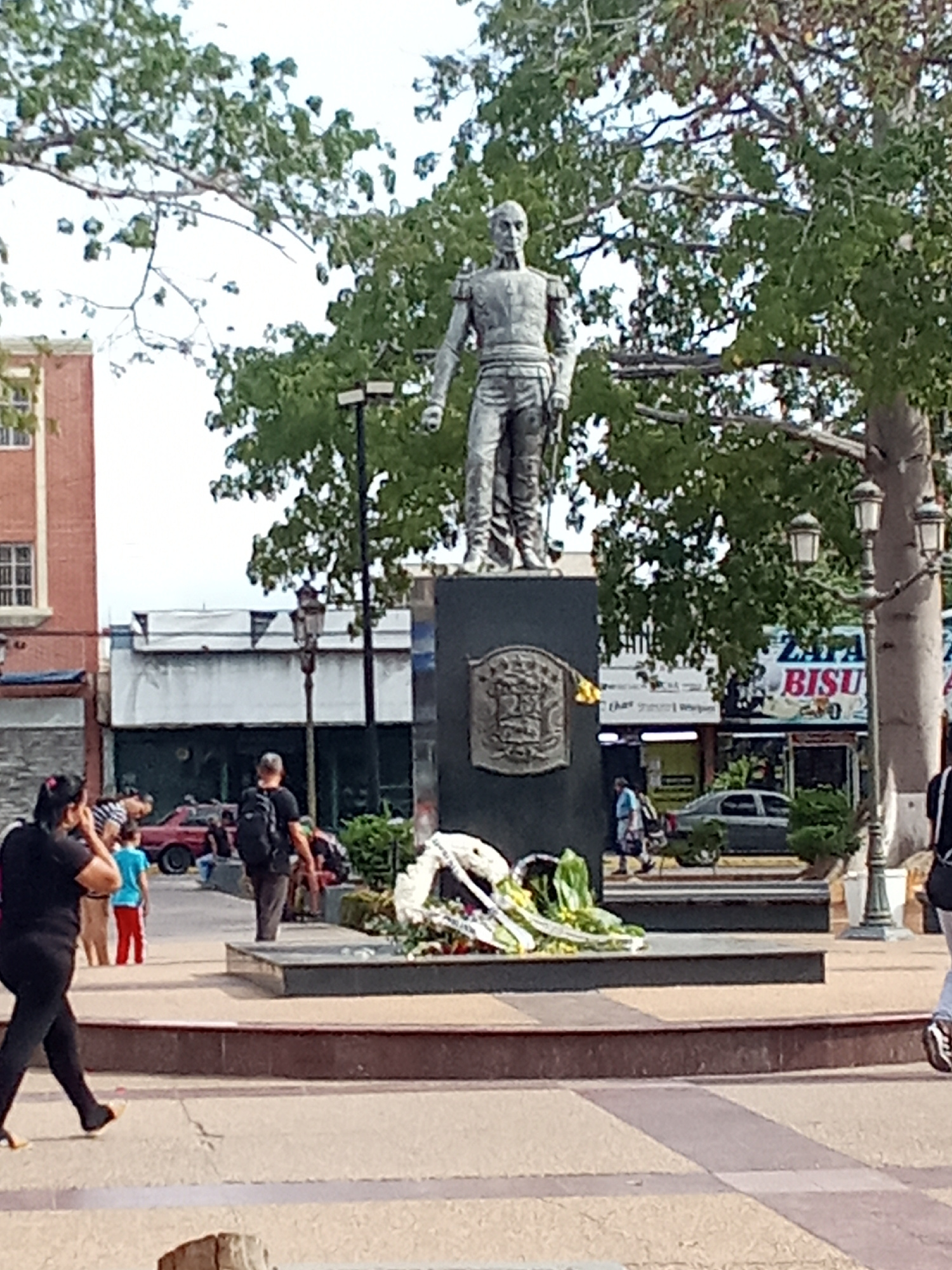 The image displays a daytime scene within a public plaza in Porlamar, Venezuela. A dark-colored statue of a male figure in a historical military uniform stands prominently on a multi-tiered dark pedes…read more