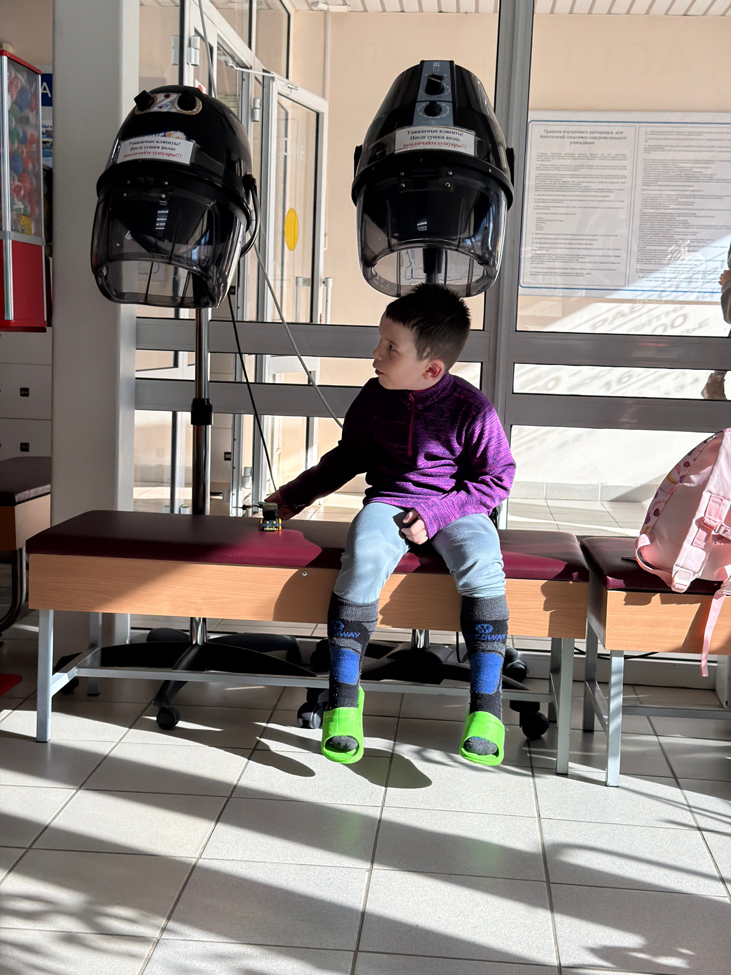 A young boy, dressed in a purple long-sleeved shirt, light grey pants, and dark socks with bright green foot attachments, lies on his back on a padded wooden bench. He appears to be engaged in physica…read more