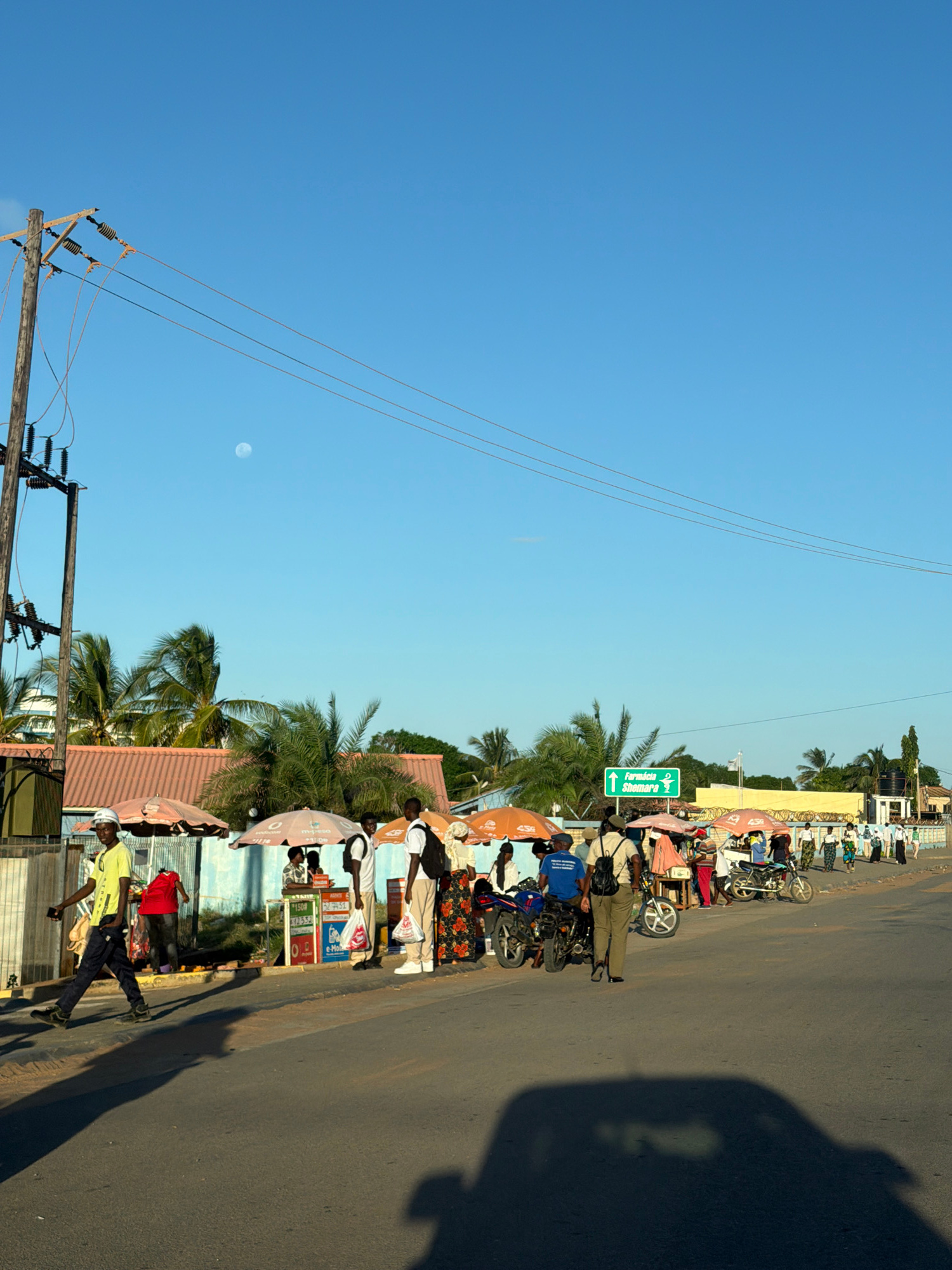 This image captures a vibrant street scene under a clear blue sky, likely in Pemba, Mozambique, as provided in the context. The time of day appears to be either early morning or late afternoon, indica…read more