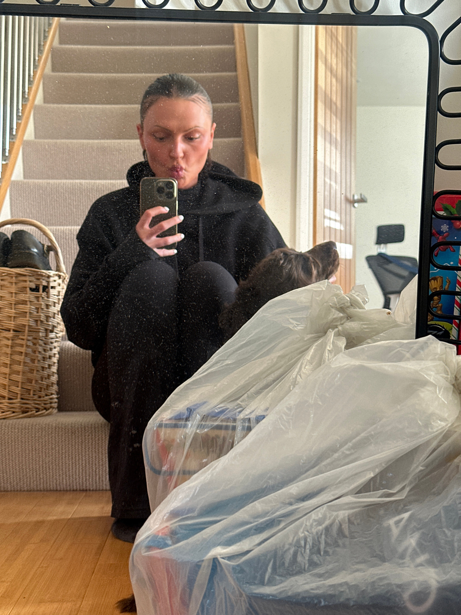 This scene depicts an indoor residential setting in the city of Wealden, United Kingdom. The image is a mirror selfie, showing an individual, presumably female, with light skin and hair pulled back, s…read more