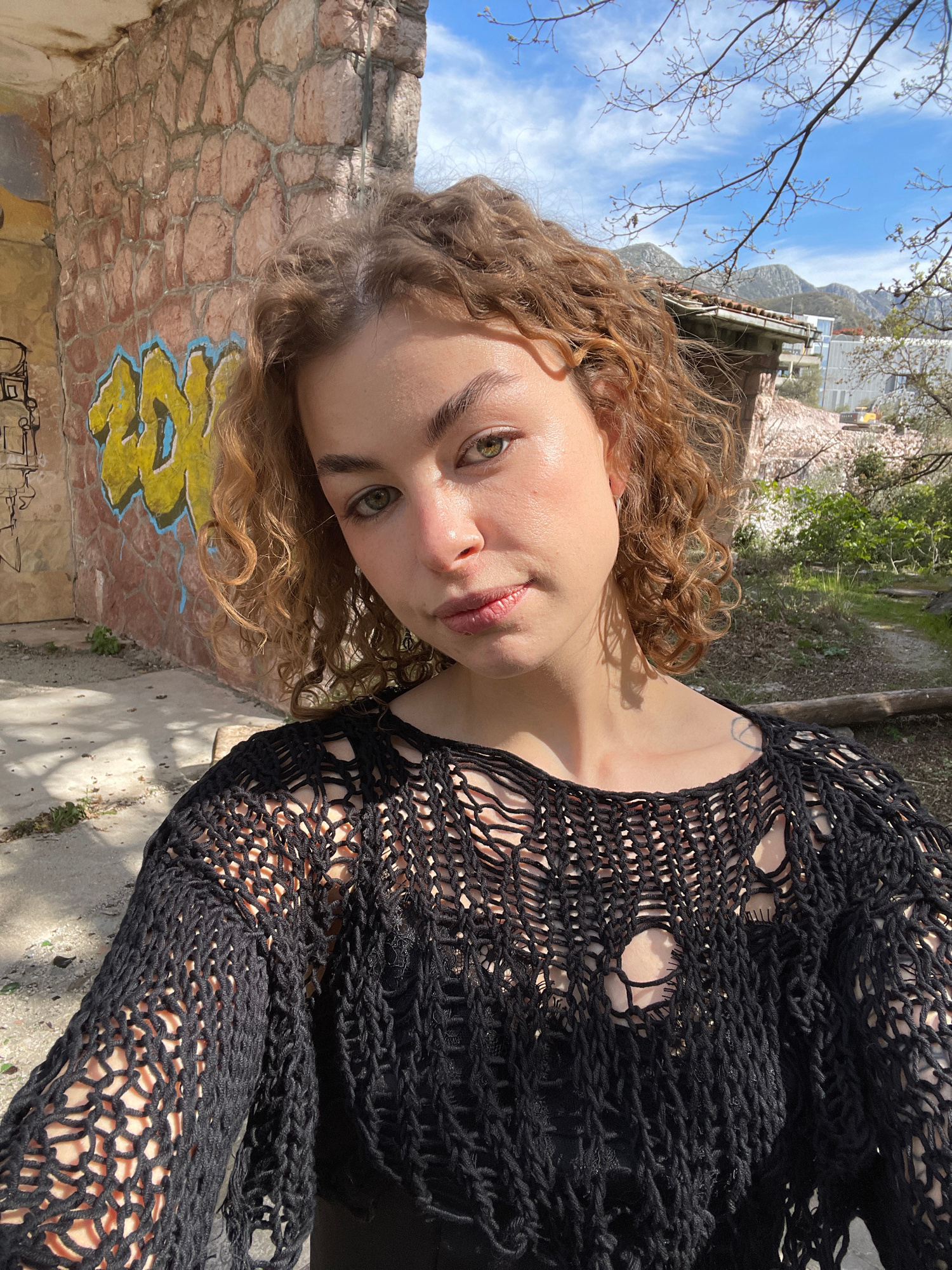 A young woman with fair skin and curly auburn hair poses for a selfie, tilting her head towards the camera. She has green eyes and is wearing a black, knitted top with large open stitches. A tattoo is…read more