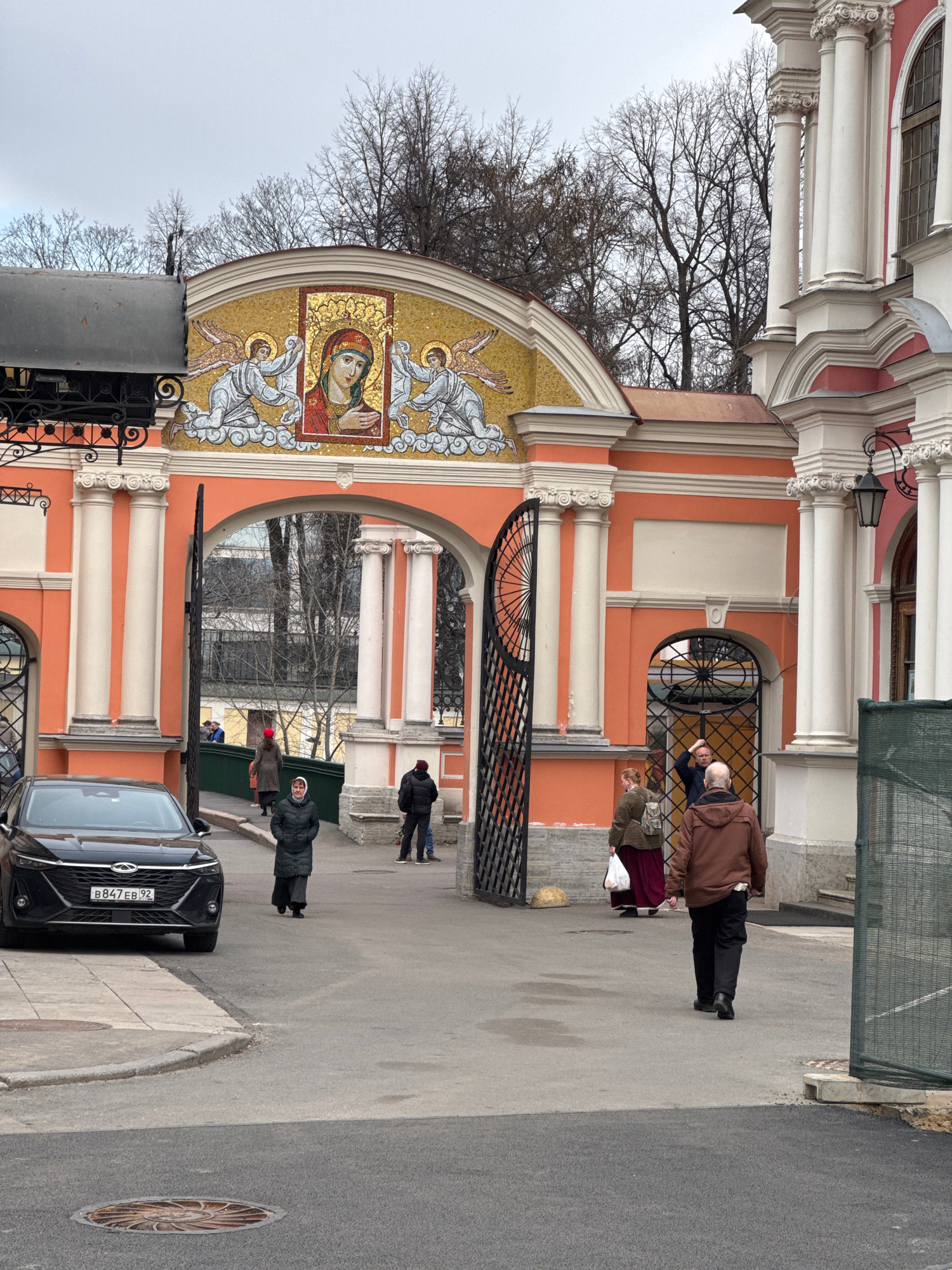 The image depicts a street scene in Saint Petersburg, Russia, with a decorative archway as a focal point. The archway is constructed with red and white columns and features a mosaic of a religious ico…read more