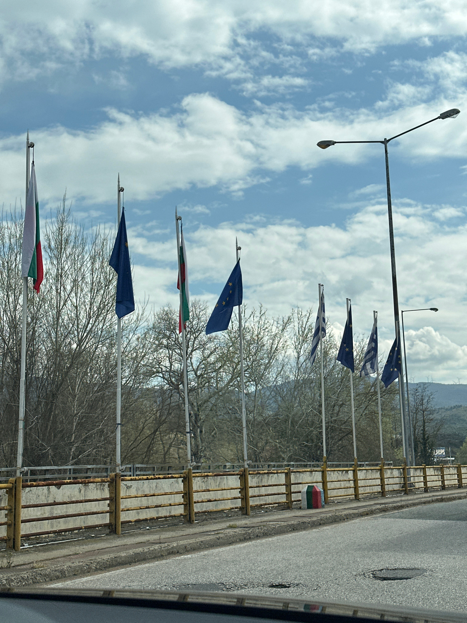 The image shows a line of flags along a road in Kulata, Bulgaria. The flags alternate between the flag of Bulgaria (white, green, and red horizontal stripes) and the flag of the European Union (blue w…read more