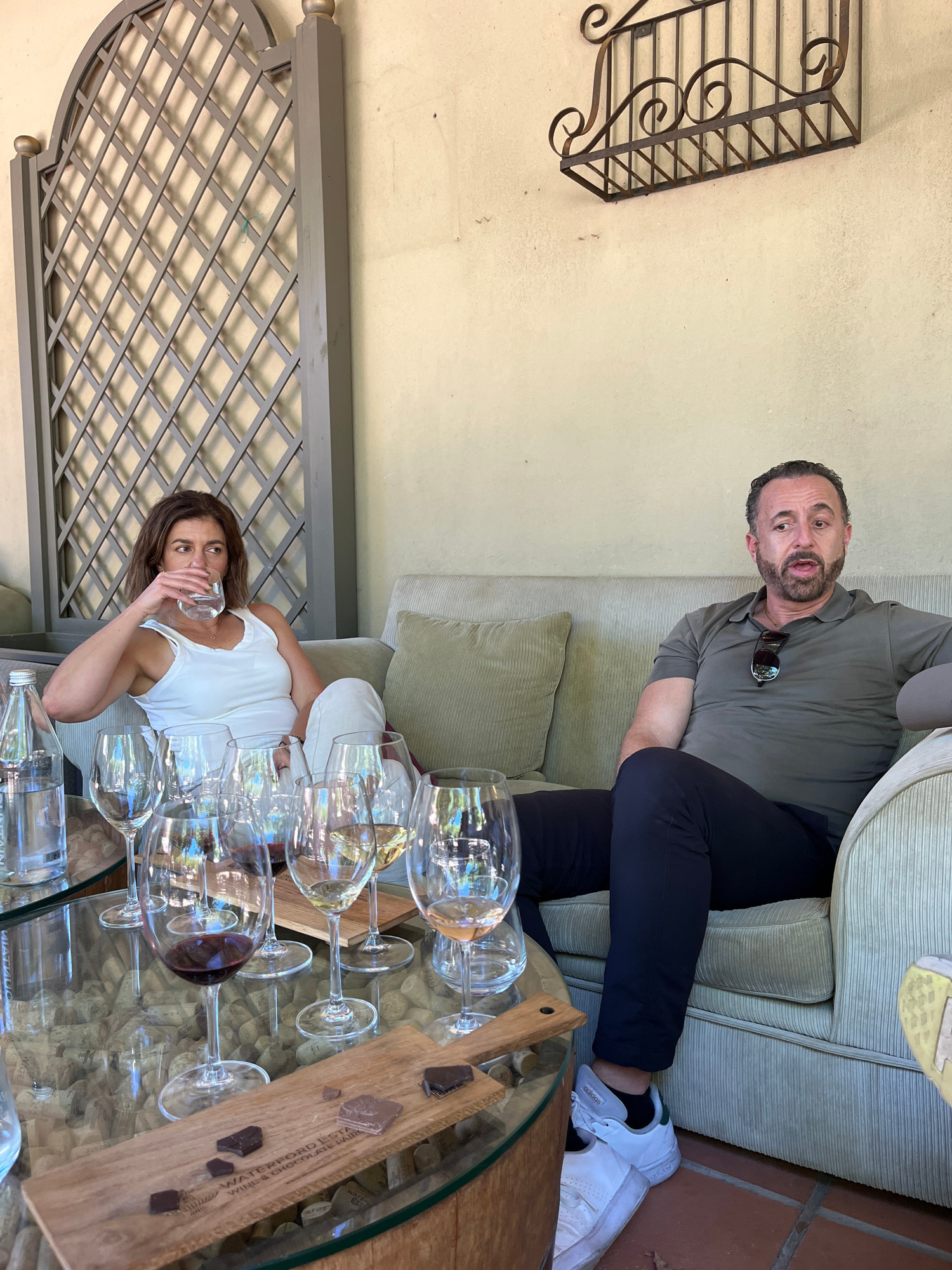A rotated medium shot features a man and a woman seated at a glass-topped table set with wine glasses and a charcuterie board, likely at a winery in Stellenbosch Nu, South Africa. The man is seated on…read more