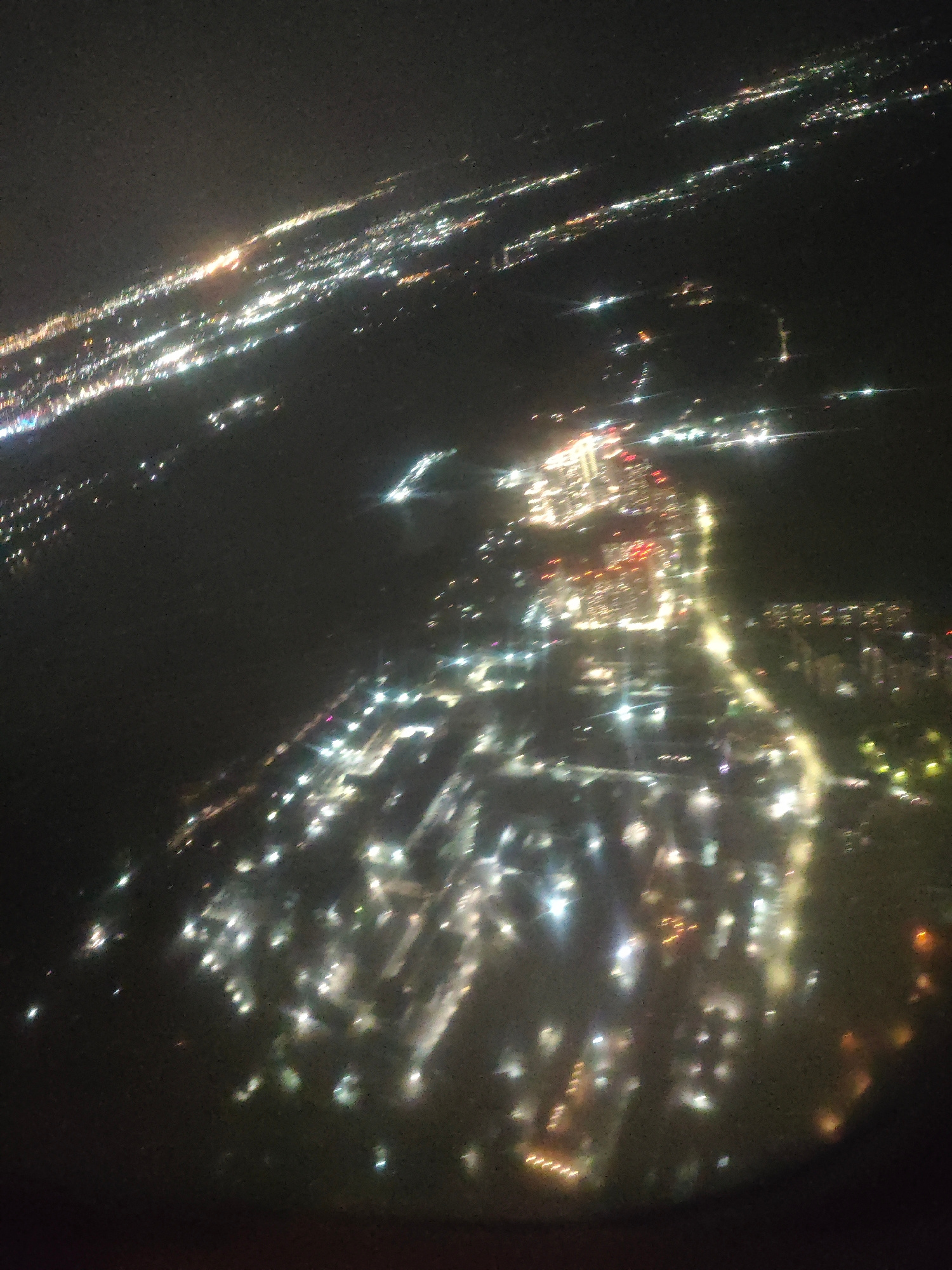 The image shows a nighttime view of a city, likely Novosibirsk, Russia, as seen from an elevated position, possibly an airplane. The city is illuminated with various lights, creating a network of brig…read more