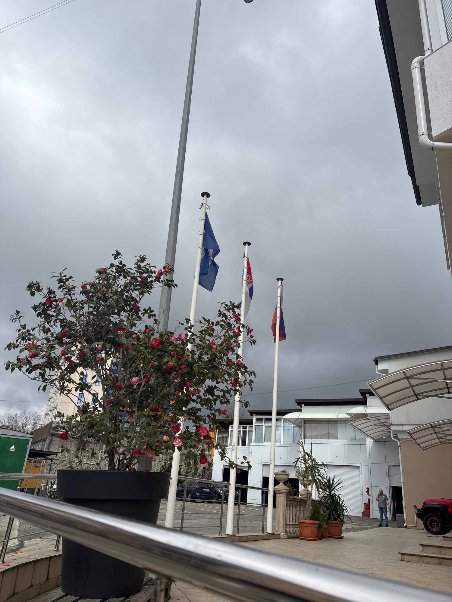 The image shows a street scene in Sochi, Russia, under an overcast sky. Three flags are hoisted on poles: one blue, one Serbian, and one Russian. A large black planter containing a blooming bush with…read more