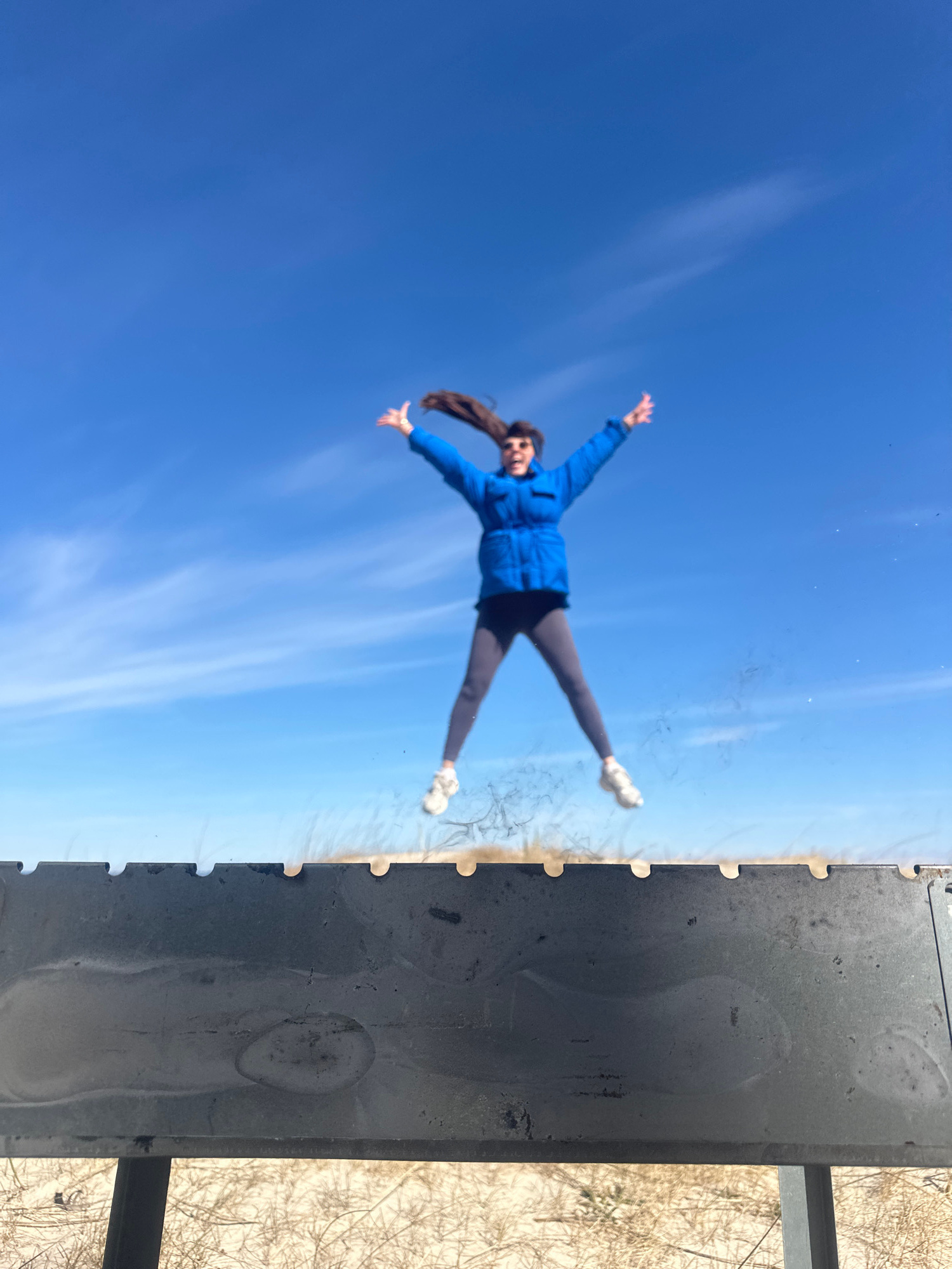 A woman wearing a blue jacket and grey pants is lying horizontally on a glass surface, arms and legs outstretched. Above her is a blue sky with white clouds. To the right of the glass surface is a dar…read more