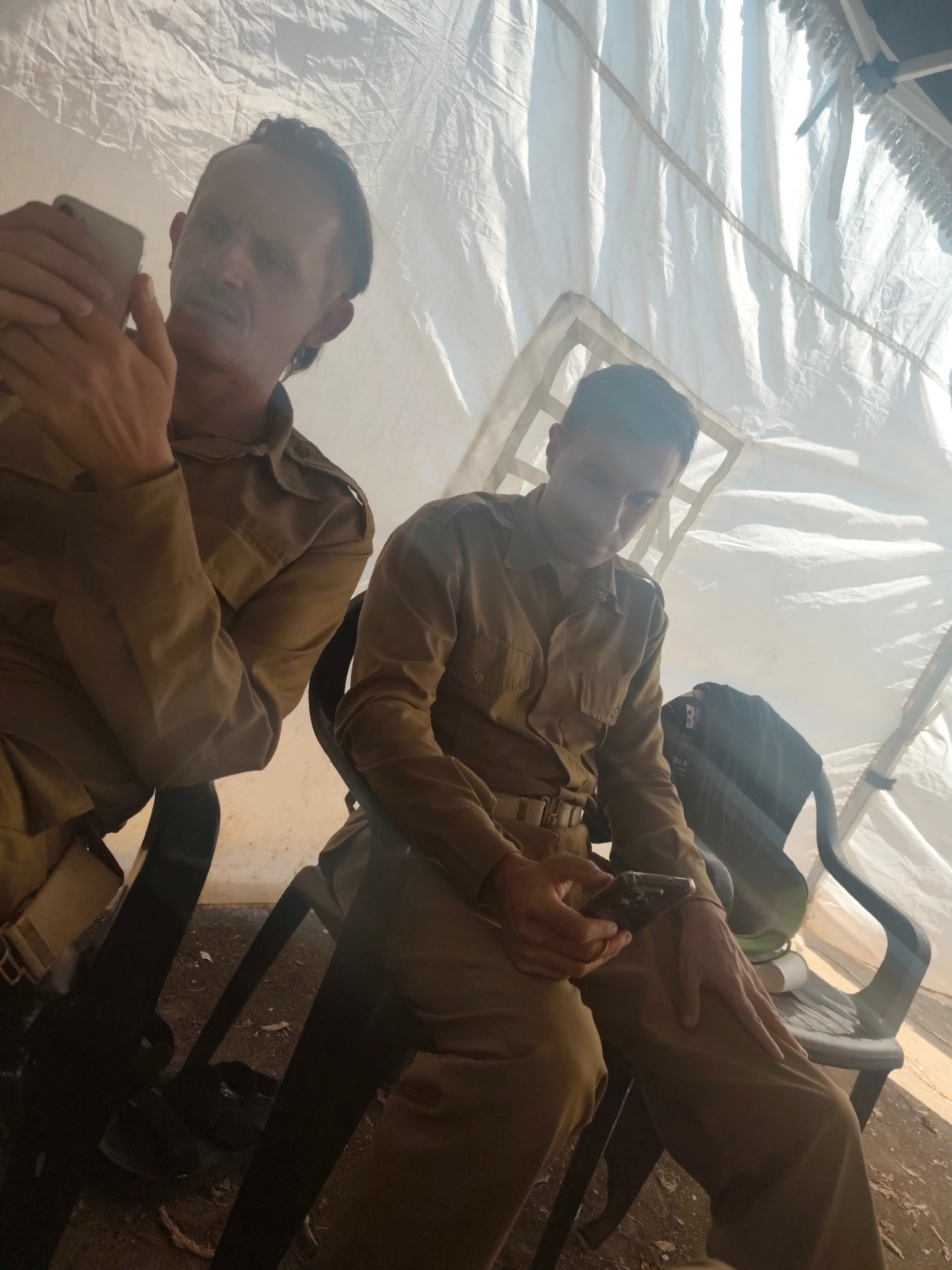 Two men wearing khaki uniforms sit in black plastic chairs inside a white tent. One man on the left is holding and looking at a cell phone. The other man on the right is also holding and looking at a…read more