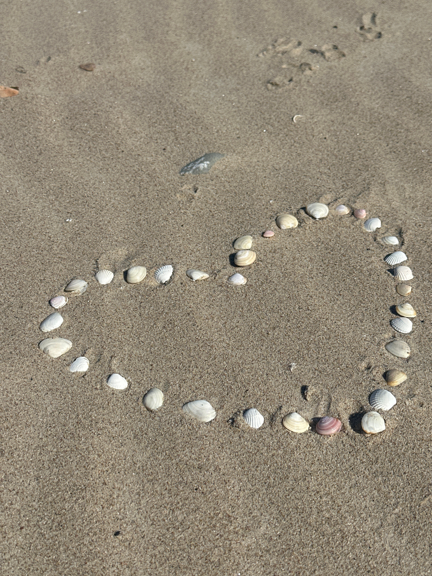 The image shows a sandy beach in Plieņciems, Latvia. Arranged on the sand is a heart-shaped formation composed of numerous seashells. There are also a few footprints in the sand to the left of the hea…read more