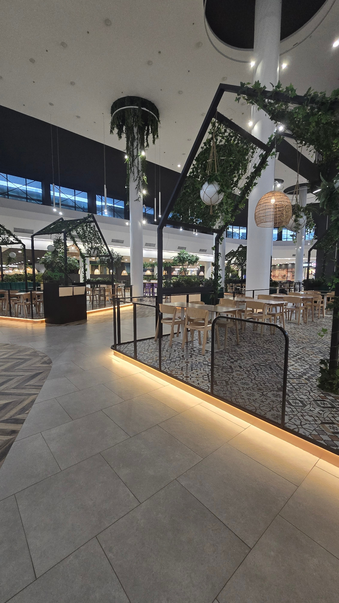 The image depicts an interior scene, likely a shopping mall or commercial space, in Stara Zagora, Bulgaria. The focal point is a restaurant area with rows of light-colored wooden chairs and tables. Th…read more