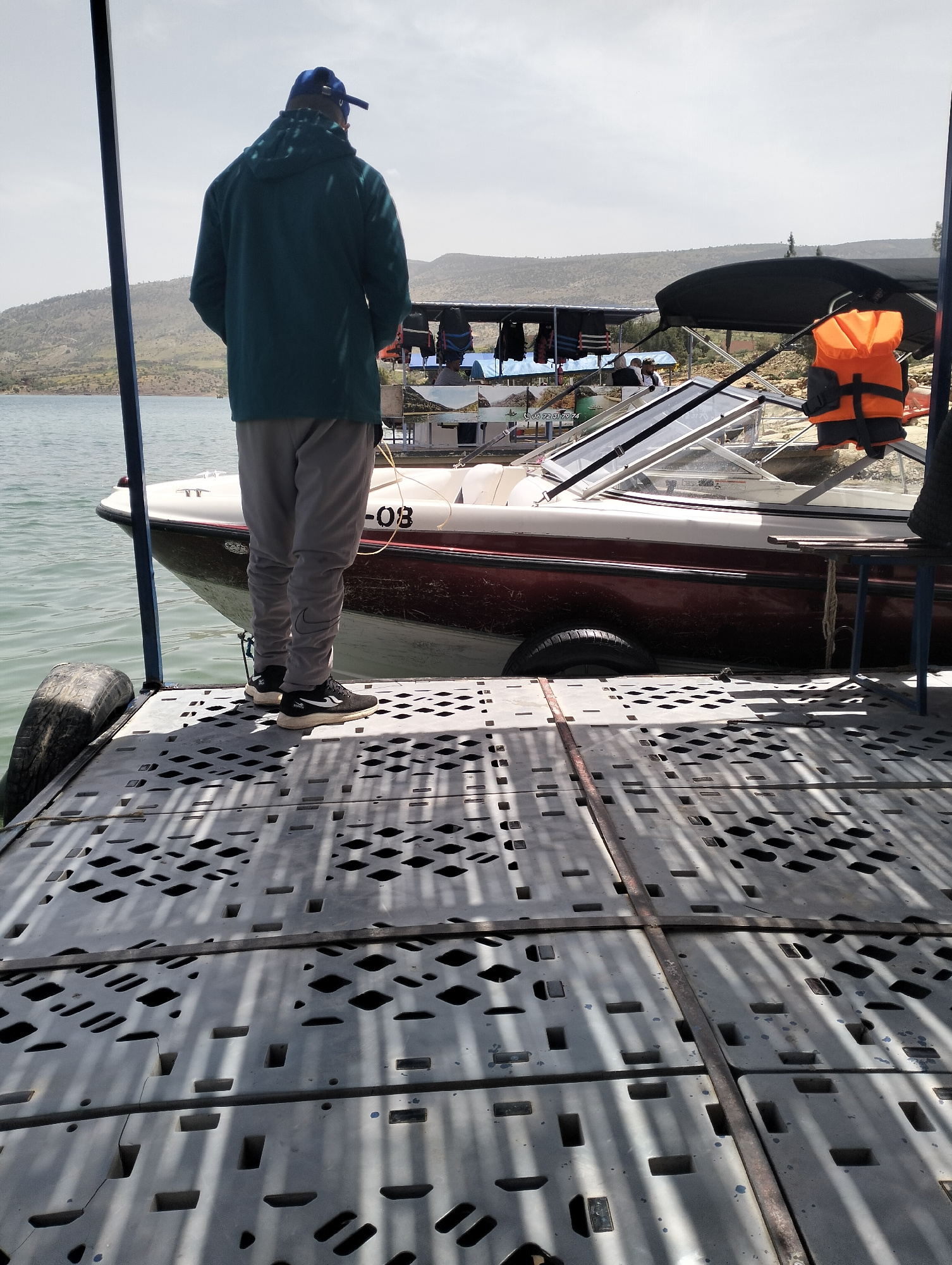 A sunny, wide-angle shot captures a serene scene on a body of water in Bin El Ouidane, Morocco. In the foreground, a man stands with his back to the camera, positioned on a grey modular floating dock.…read more