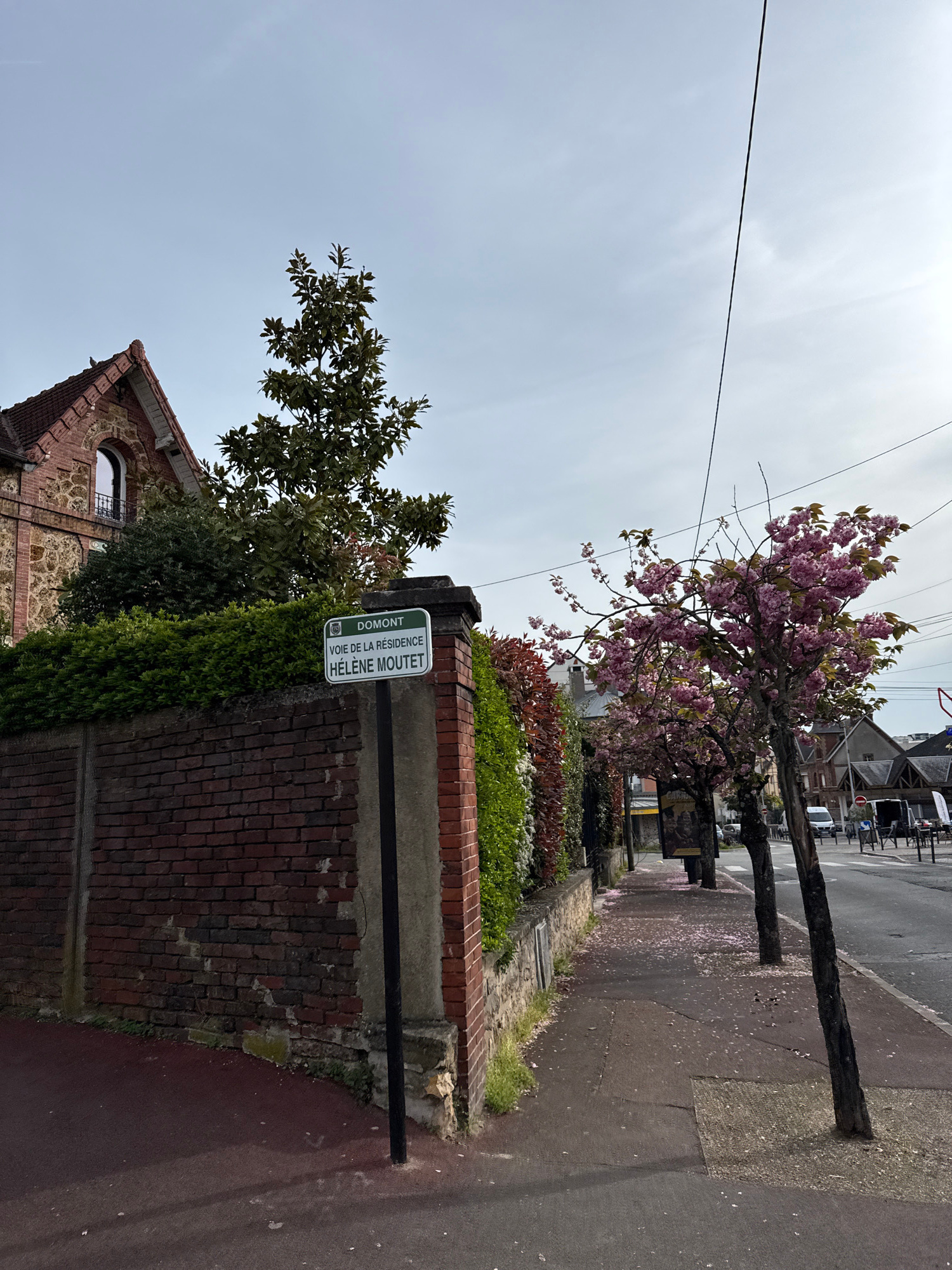 The image shows a street scene in Domont, France. A street sign indicates "DOMONT VOIE DE LA RESIDENCE HELENE MOUTET." A brick wall runs along the sidewalk, covered with green ivy and various plants.…read more