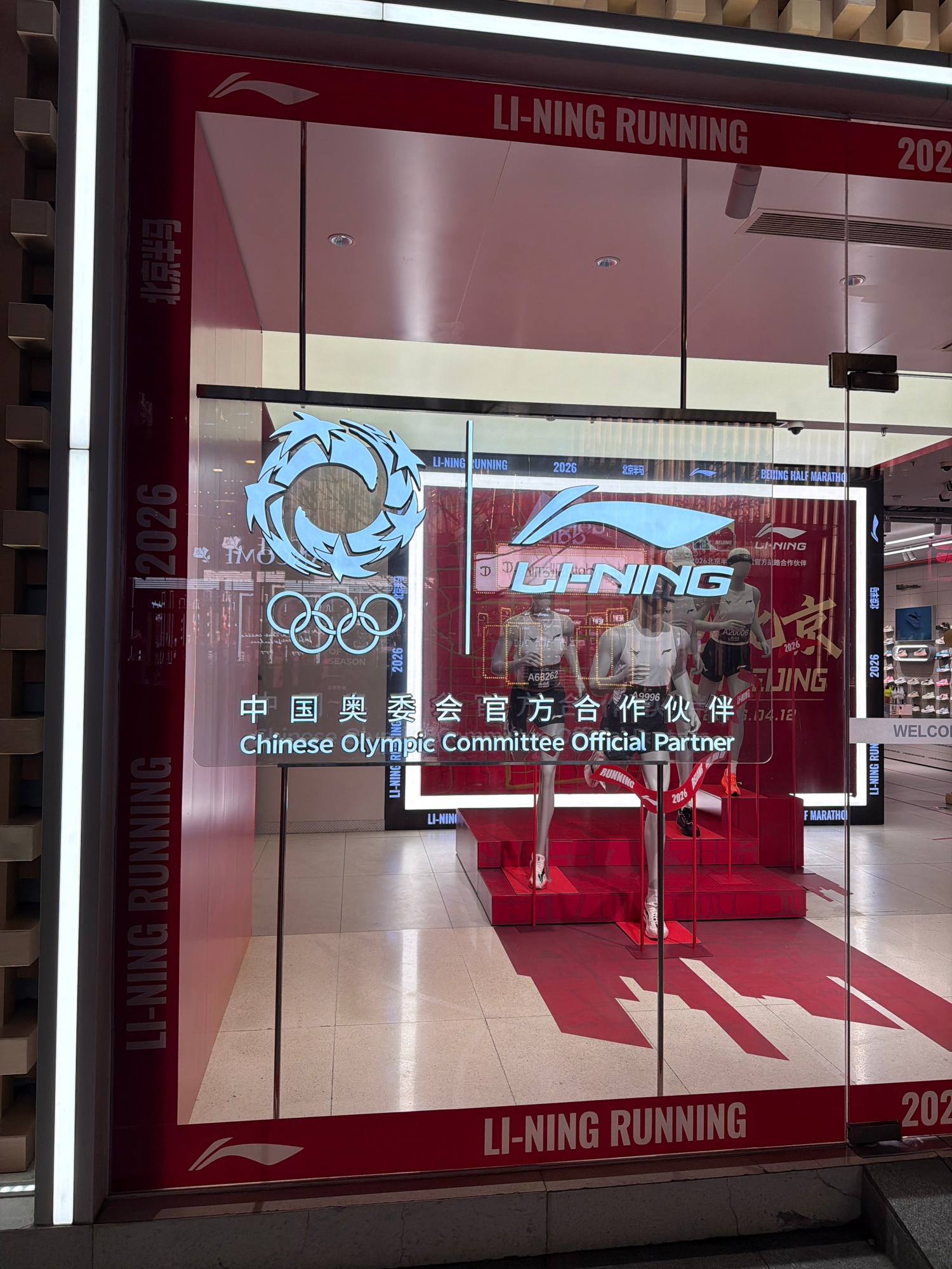 Here is a detailed description of the image: The image shows a storefront for Li-Ning Running in Dongcheng District, China. The store is brightly lit with neon lights outlining the window display. Th…read more