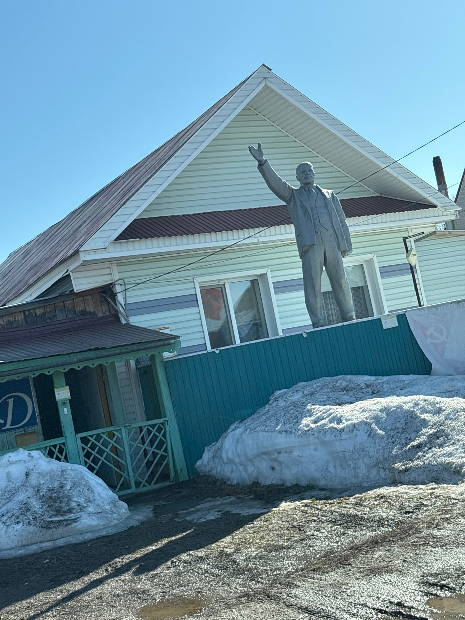 The image captures a statue of Vladimir Lenin in front of a building in Kryukovo, Russia. Lenin is depicted in a suit, arm outstretched in a gesture of leadership. The building behind the statue has s…read more
