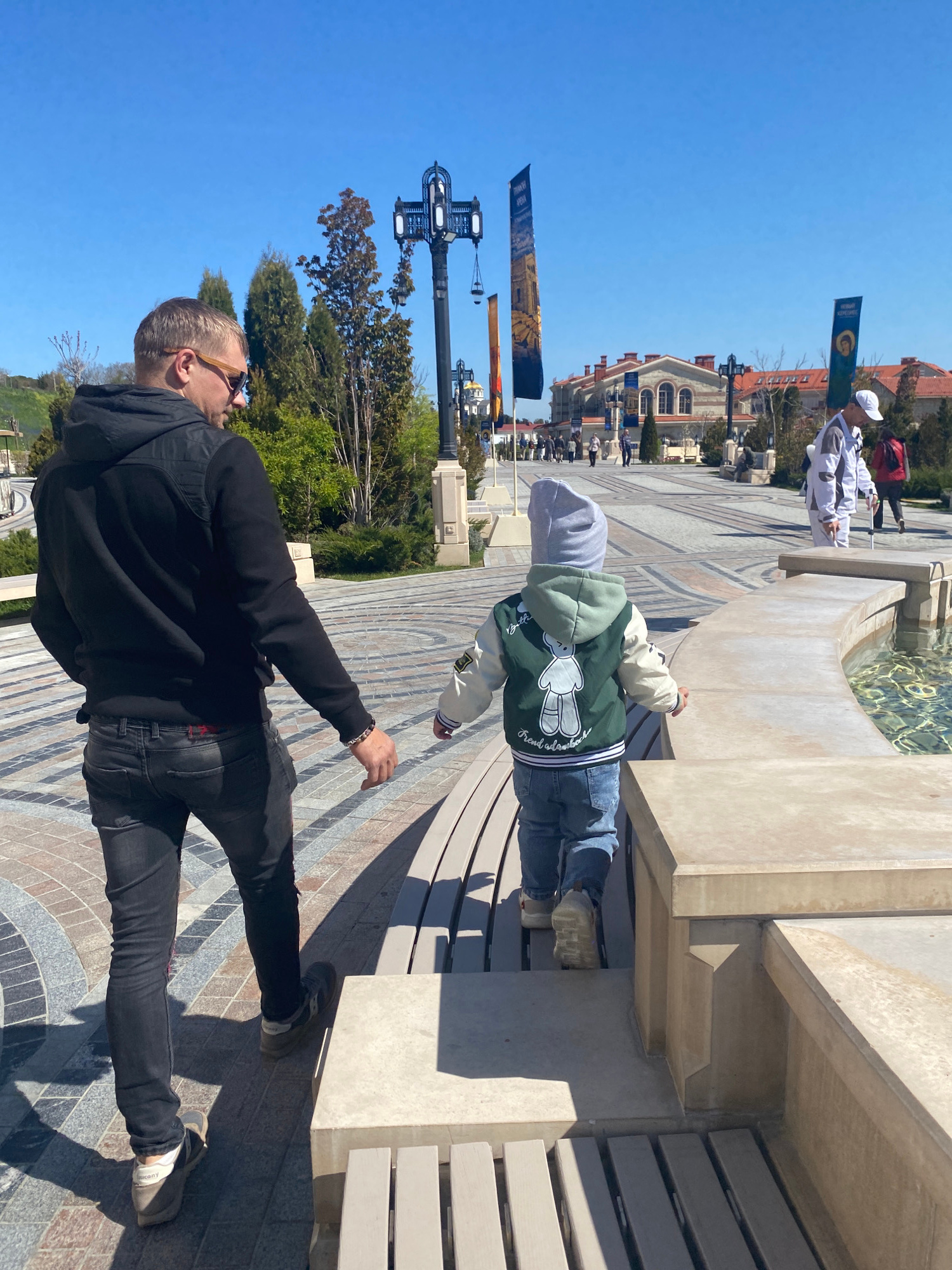 The image depicts an outdoor scene in Sevastopol, Ukraine, under a clear, bright blue sky on a sunny day. In the foreground, a man is seen from the back and side, wearing black jeans, a black hoodie,…read more