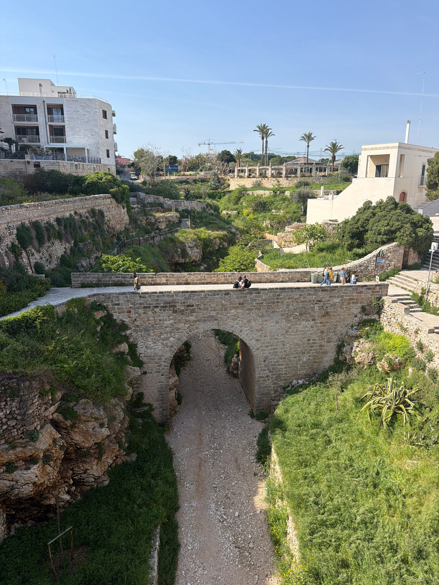 The image captures a high-angle, slightly tilted view of a stone bridge in Polignano a Mare, Italy. The bridge, constructed of light-colored stones, spans a dry riverbed filled with gravel. The stone…read more