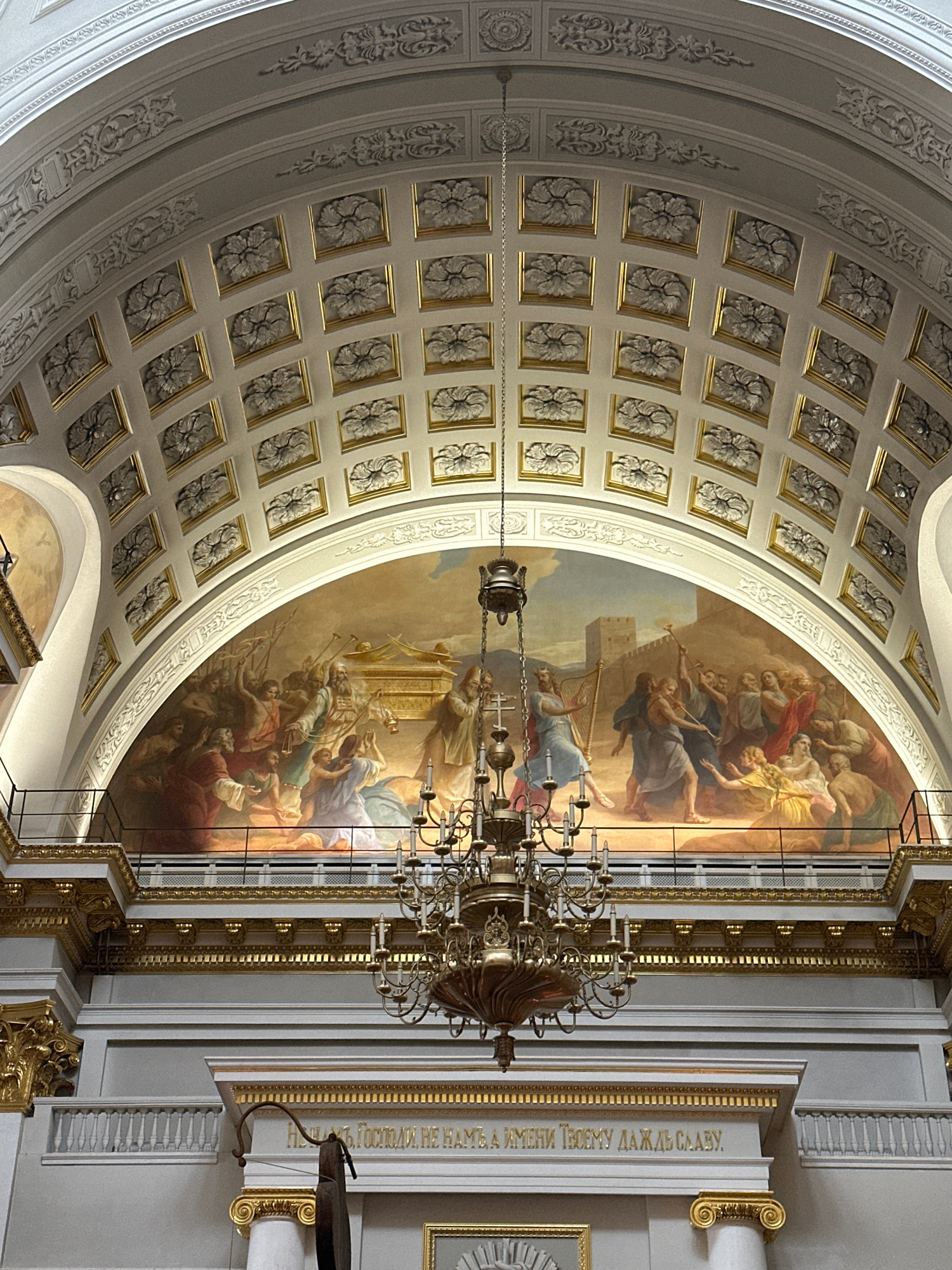 The image shows the interior of a cathedral, likely in Kazan, Russia, focusing on the ornate ceiling. The ceiling is divided into two main sections: one side is decorated with repeating square panels…read more