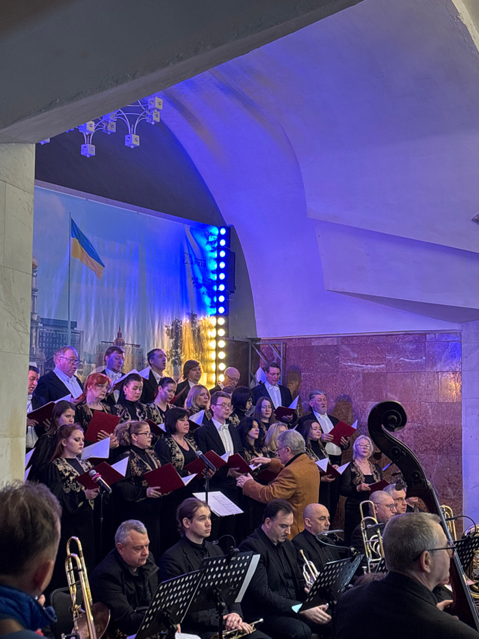 A large choir and orchestra are performing in an underground public space, likely a subway station, in the city of Unknown, Unknown. Approximately 25-30 choir members, dressed in black with gold patte…read more