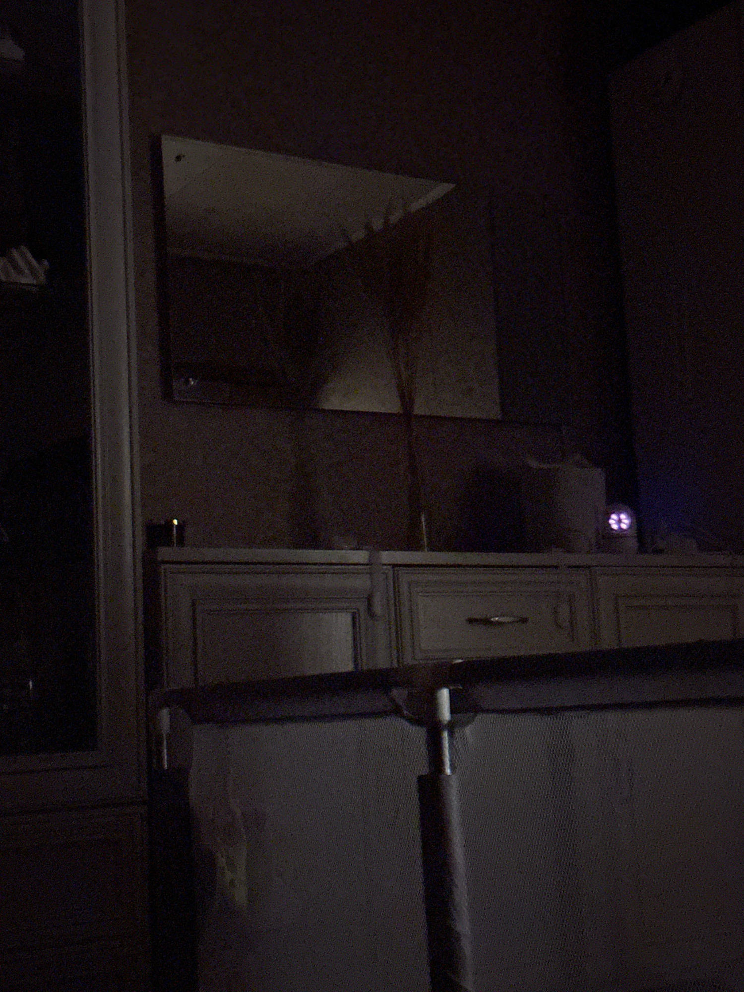 The image presents a dimly lit interior scene. A mirror reflects a partial view of a room with a hint of daylight. Adjacent to the mirror is a cabinet with a handle. A roller blind partially obscures…read more