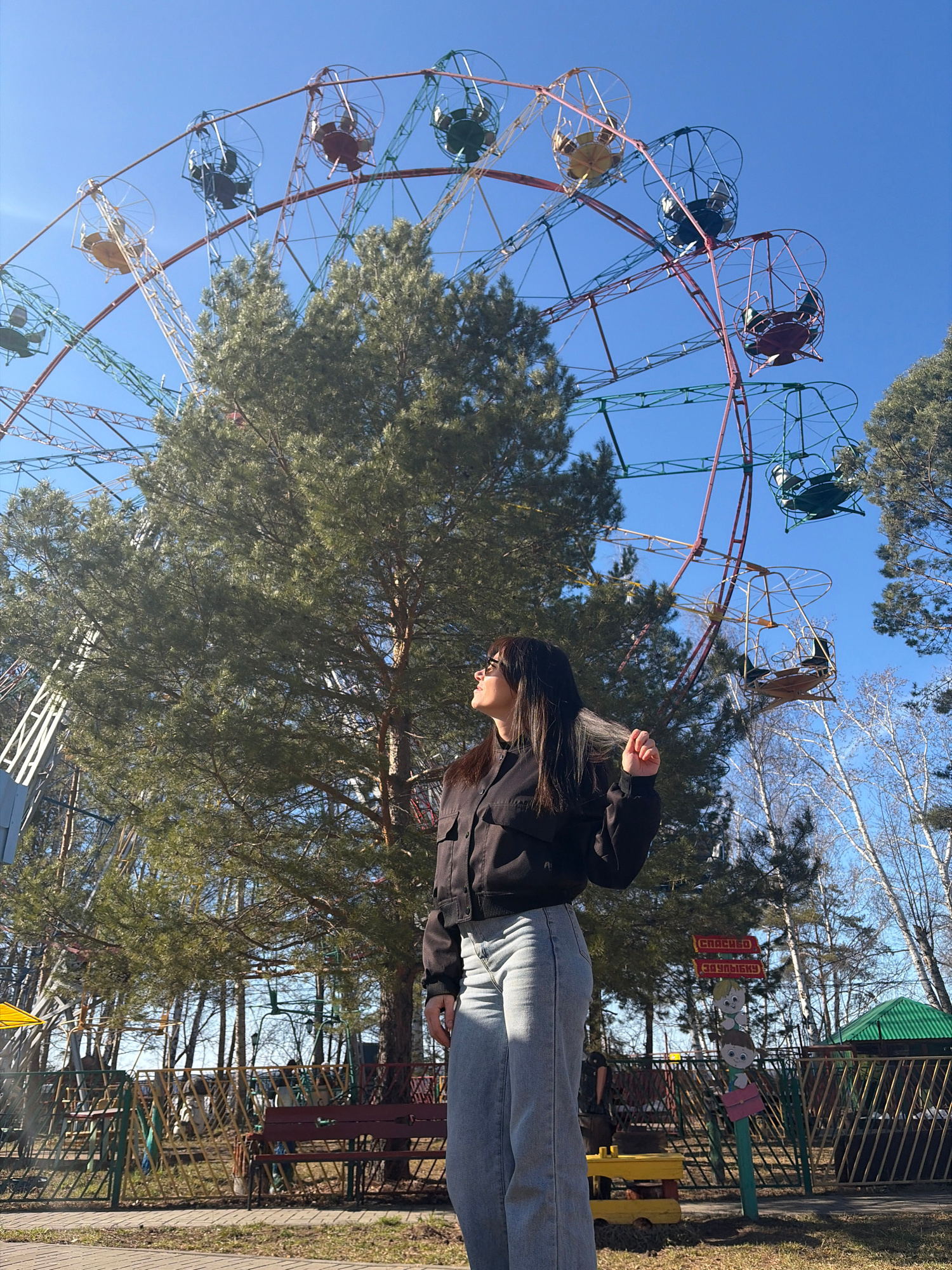 This brightly lit, outdoor image captures a scene at what appears to be an amusement park or recreational area in Chaikovsky, Russia. The central subject is a young woman, seen from the waist up in p…read more