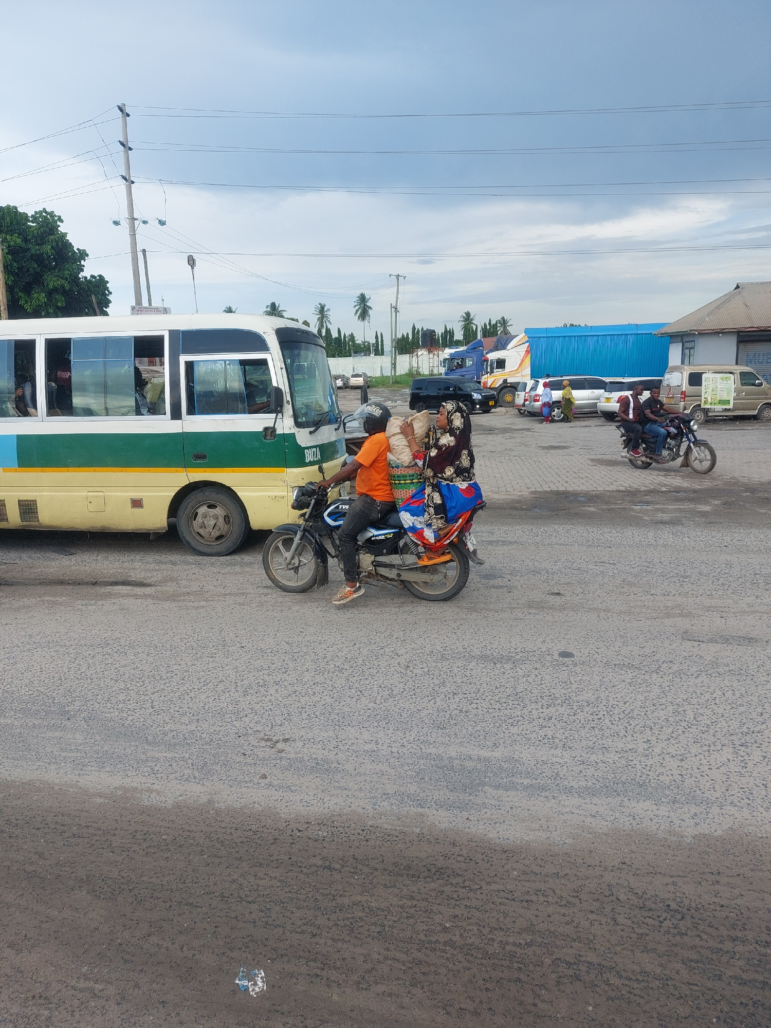The image depicts a scene on a paved road in Dar es-Salaam, Tanzania. A yellow and green bus is parked on the left side of the road. A motorcyclist wearing an orange shirt and helmet is driving next t…read more