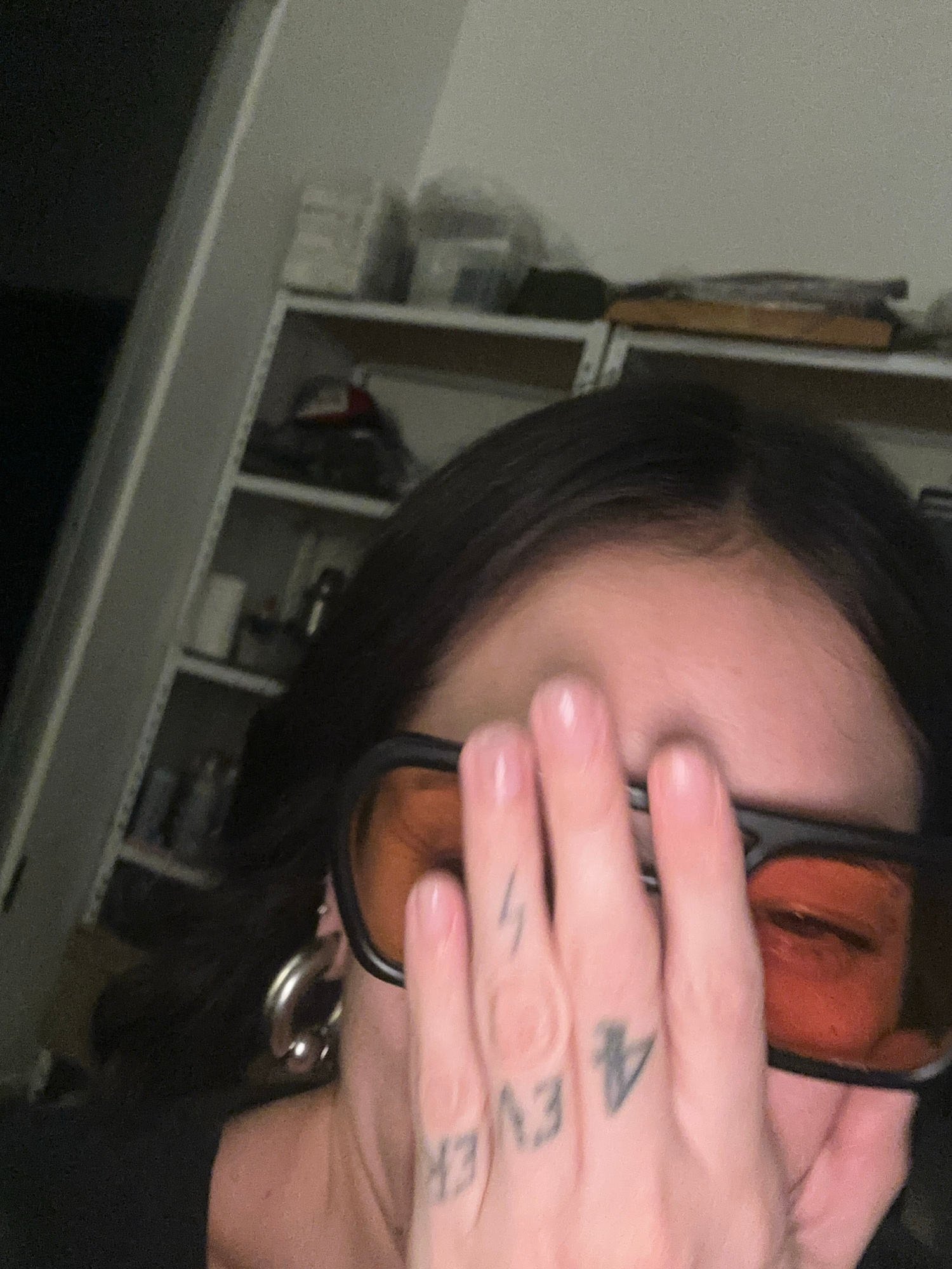 The image presents a close-up, dimly lit indoor scene. A person with dark hair, parted centrally, is partially depicted. Their right hand is raised, covering the left side of their face, including theβ¦read more
