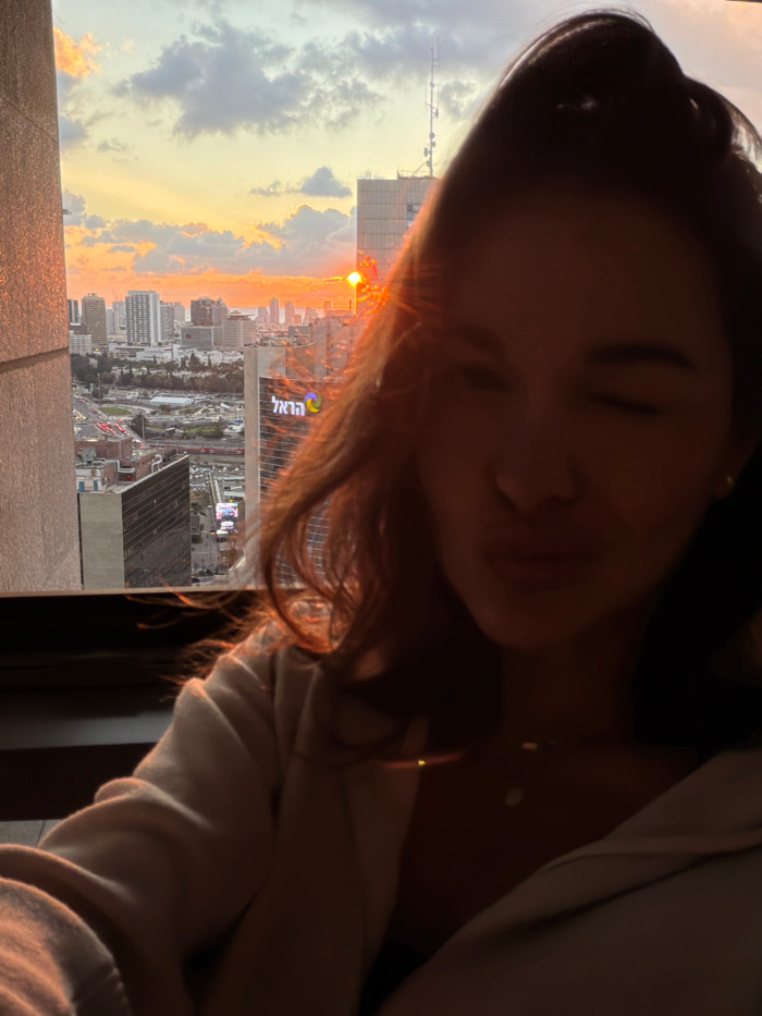The image presents a high-angle view overlooking the city of Ramat Gan, Israel, during sunset, with a female individual in the immediate foreground. The individual's upper body, occupying the right and lower-middle sections of the frame, is largely in silhouette due to strong backlighting from the setting sun. She possesses dark, wavy hair, and her visible facial expression includes a closed left eye (viewer's perspective, indicating a wink) and pursed lips. She is attired in a light-colored hooded garment and wears a delicate necklace. The urban background is dominated by a city skyline illuminated by the low sun, visible as a bright orb near the horizon, casting prominent orange and yellow light across a partly cloudy sky. A distinctive multi-story building in the mid-ground features the illuminated Hebrew text 'הראל' (Harel), identifying it as the Harel Tower, situated within Ramat Gan's Diamond Exchange District. Additional high-rise structures, roadways, and general urban infrastructure are visible throughout the cityscape. A tall building topped with an antenna is situated to the right of the Harel building. A dark, vertical structural element, likely a window frame or building column, partially obscures the left edge of the foreground. | Open Wire