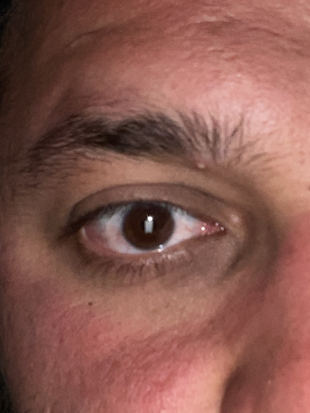 Close-up image of a person's right eye and surrounding facial features. The eye has a brown iris and a visible reflection. The skin around the eye and on the adjacent cheek appears red and textured. A…read more