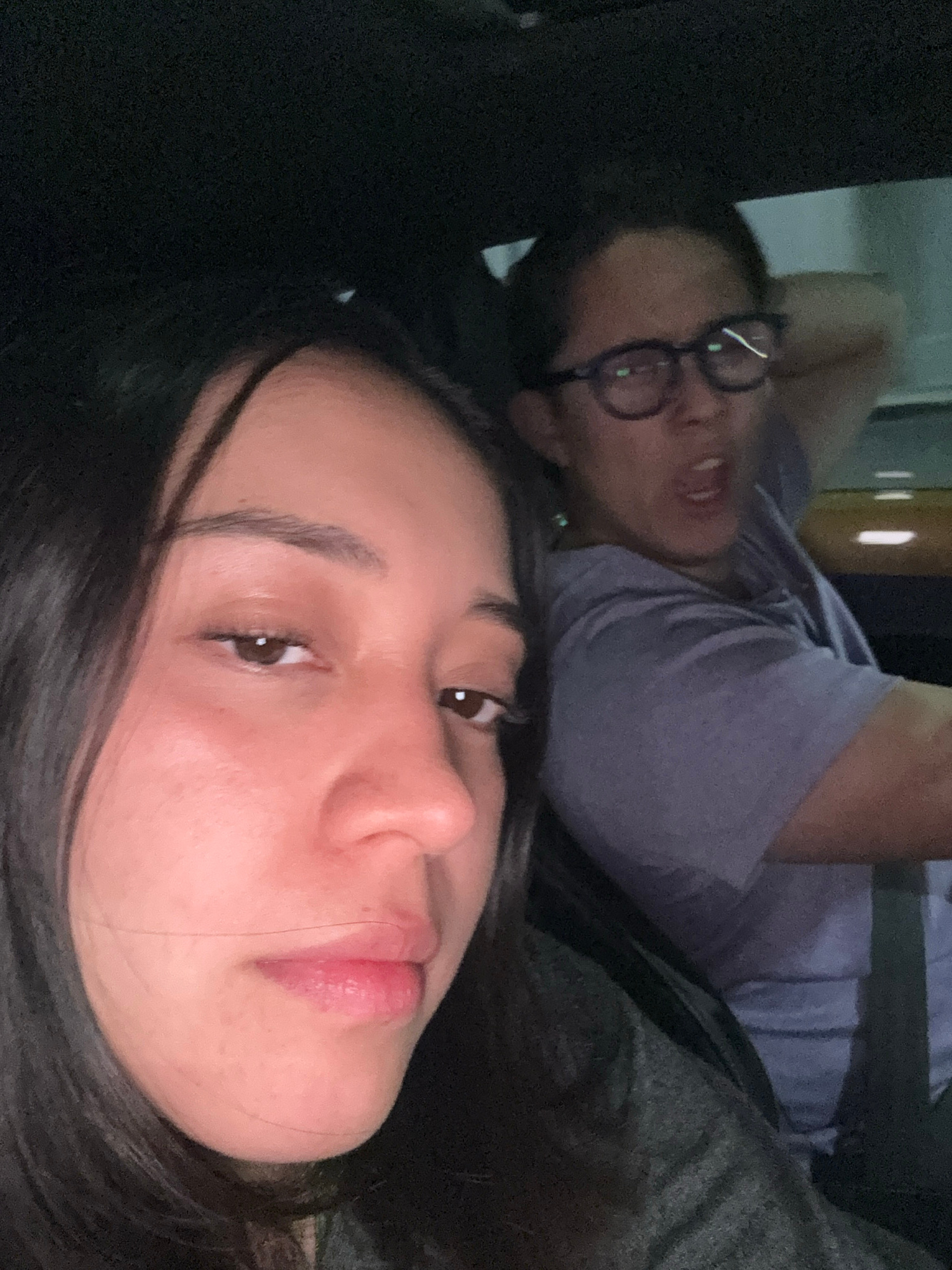 Two people are lying down. One person is in the foreground, appearing younger, with dark hair, brown eyes, and light skin. The other person is in the background, wearing glasses and a light purple t-s…read more