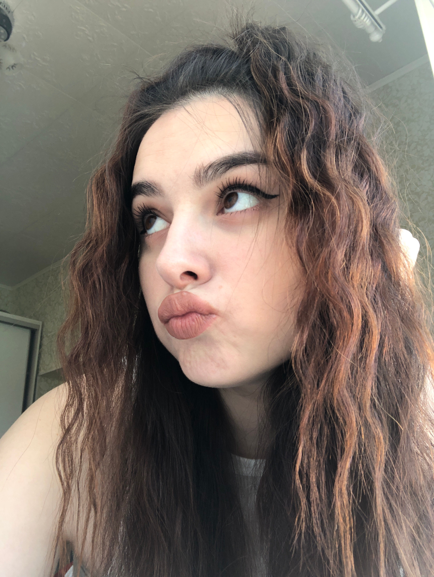 A woman with long, wavy brown hair and distinct eyeliner is making a "duck face" pose. The background appears to be an interior setting, possibly a bathroom, with patterned wallpaper or tile visible i…read more