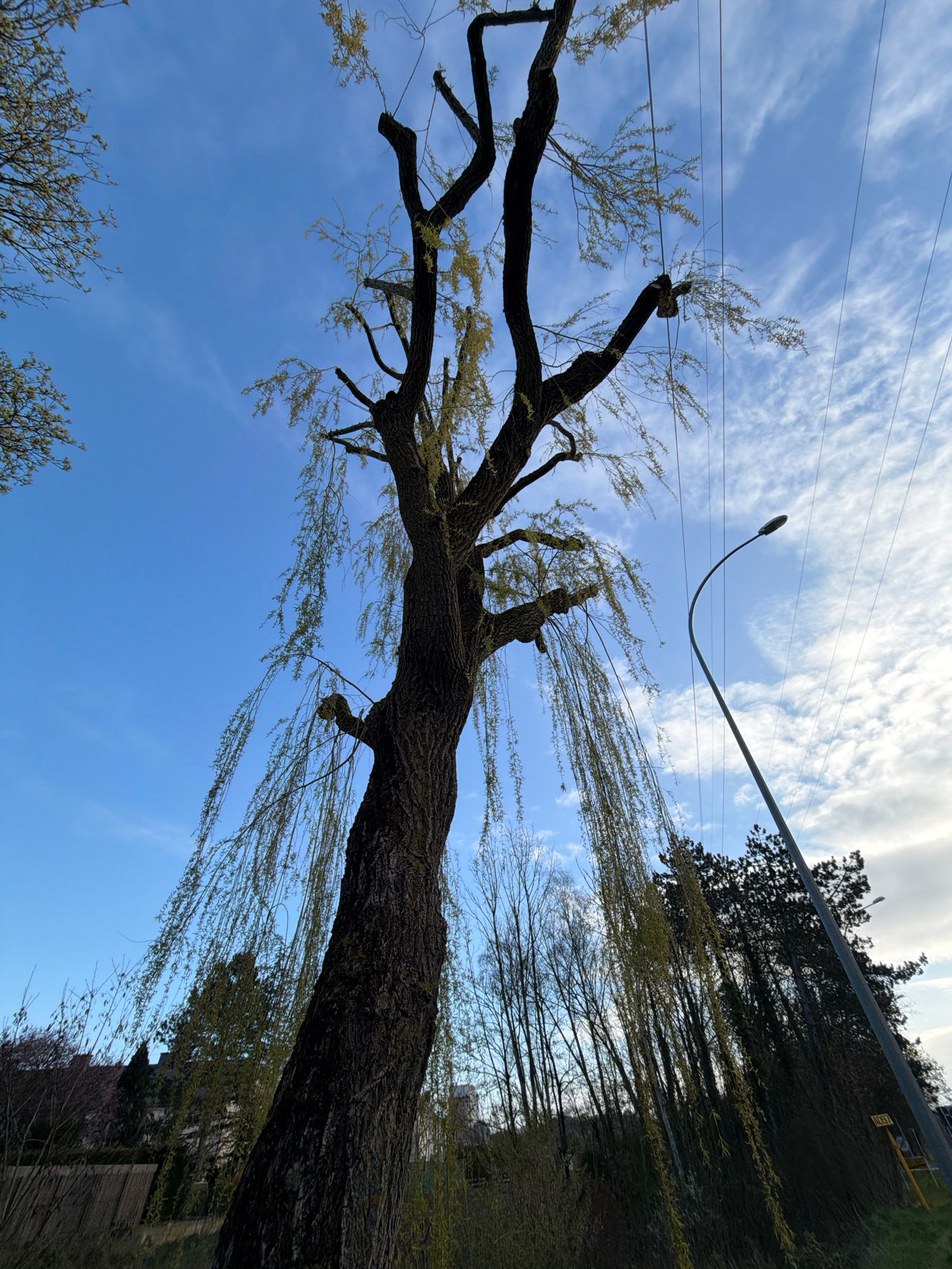The image presents a view looking up at a large, mature willow tree with a thick, dark trunk and spreading branches, taken in Esch-sur-Alzette, Luxembourg. The tree has thin, weeping branches with spa…read more