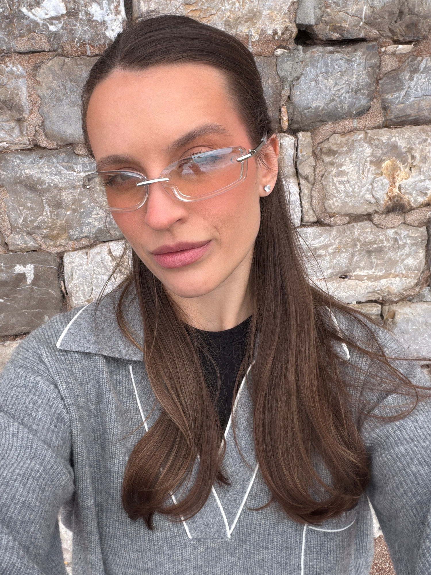 A young woman lies on a stone surface in Petrovac centar, Montenegro. She wears glasses with clear frames and a gray sweater with white piping. Her long, brown hair is partially spread out on the ston…read more