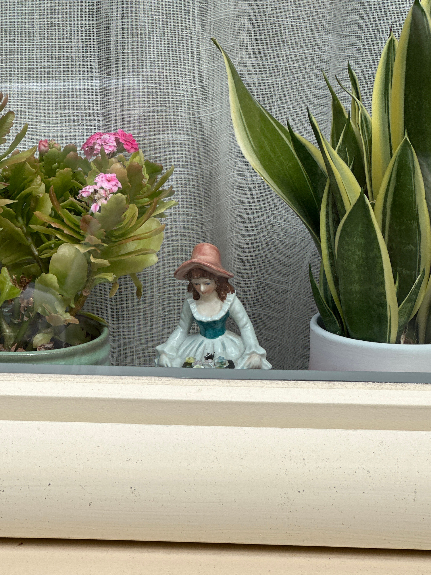 The image shows a windowsill with two potted plants and a figurine. The top plant is a snake plant in a white pot. The bottom plant is a Kalanchoe with pink flowers, in a green pot. Between the plants…read more