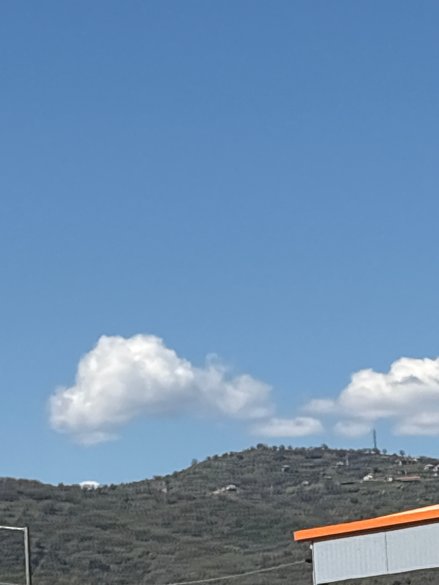 A daytime landscape with a blue sky and white clouds. In the background, there's a mountain covered in greenery, possibly located near Struma, Bulgaria. On the far right, a structure with an orange an…read more