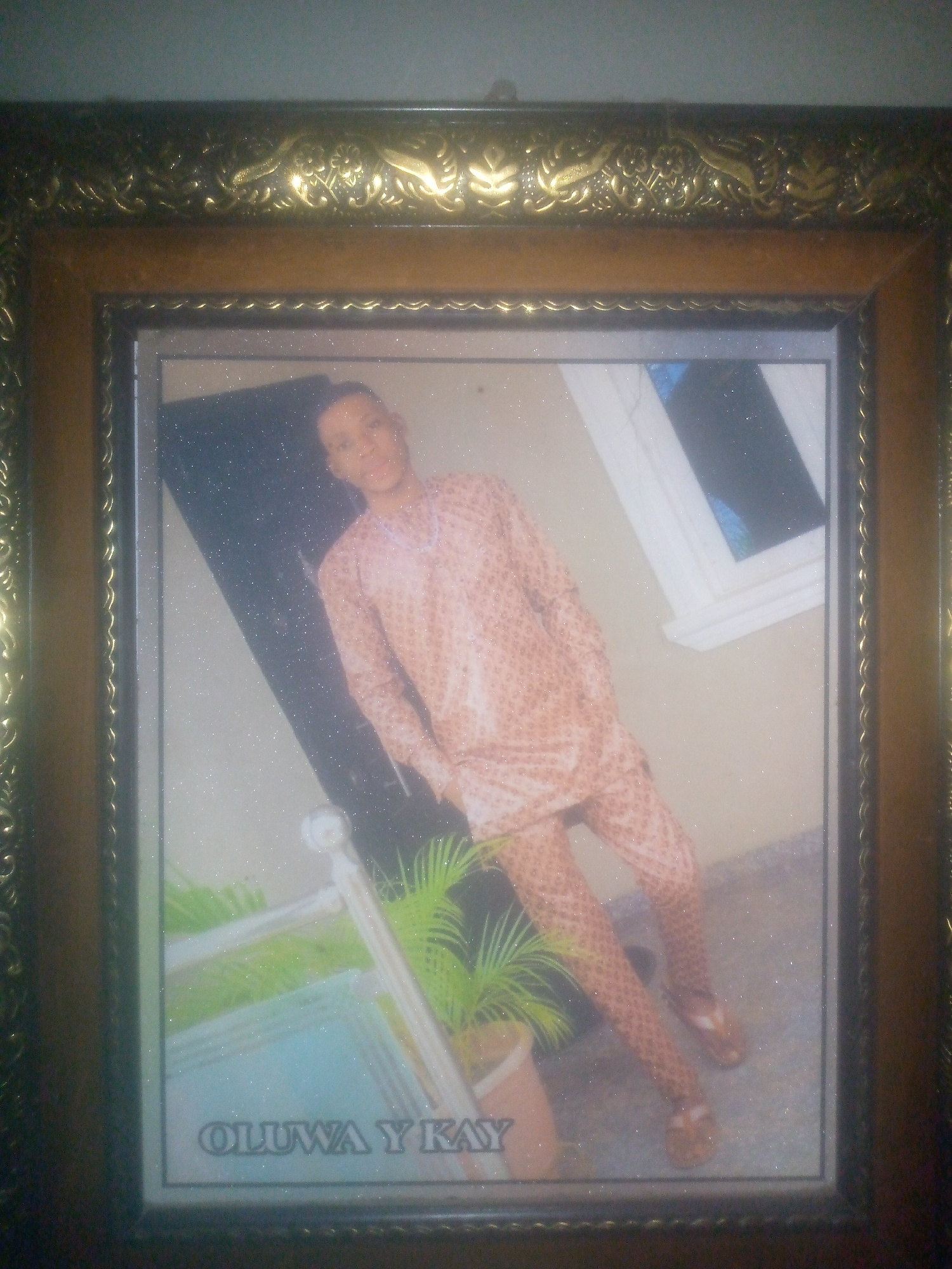 A framed photo of a person standing in front of a dark background and window. The person is wearing a patterned shirt and pants. There is a potted plant in the lower left corner of the frame. The name…read more
