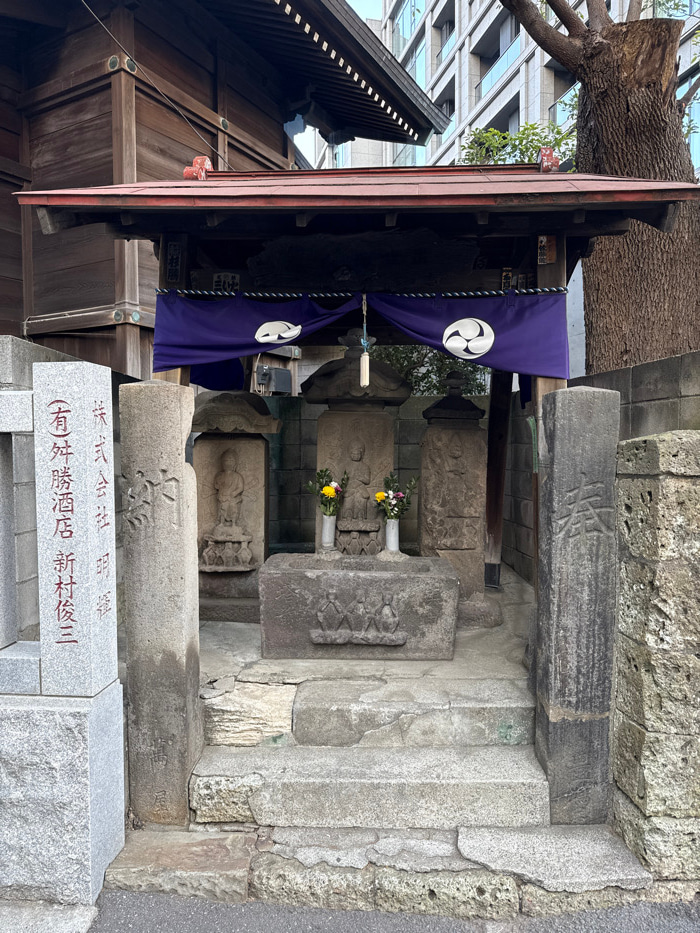 A small Shinto shrine with stone elements is set against a modern backdrop. Carved stone figures are displayed on ledges, with floral offerings in vases. A wooden structure with a traditional roof sta…read more
