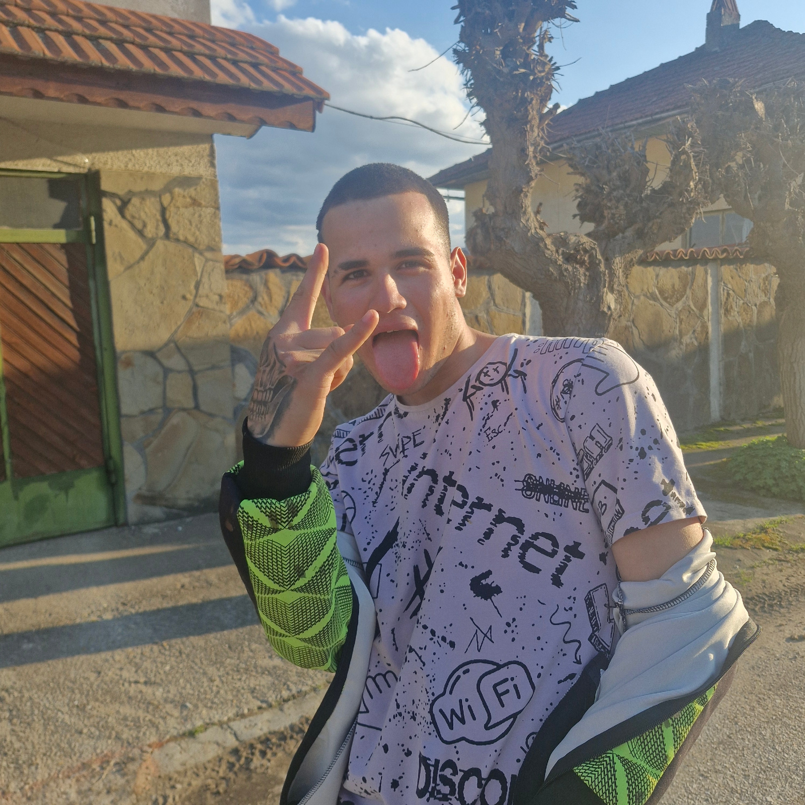 A light-skinned male with a shaved head, wearing a graphic-print white t-shirt with a white jacket over it and a lime green arm, is sticking his tongue out and making a "peace" sign with his left hand…read more
