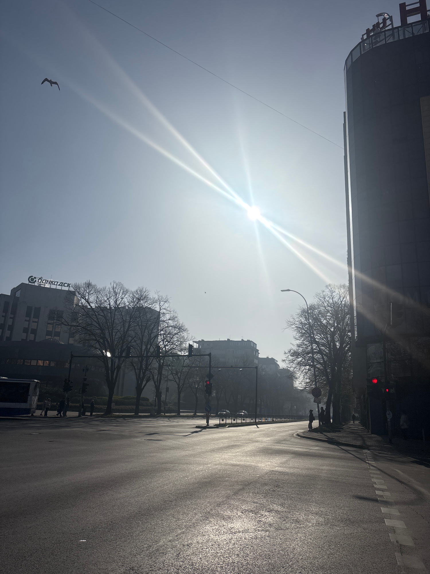 The image captures a vibrant, sun-drenched urban street scene in Varna, Bulgaria, viewed as if rotated counter-clockwise, with the sky on the left and the street on the right. The strong, low-angle su…read more