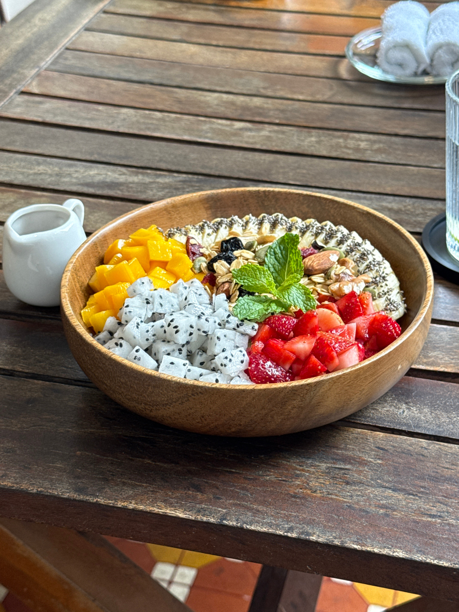On a weathered, wooden table sits a partially filled wooden bowl. The bowl contains four distinct sections: sliced bananas topped with chia seeds, a mix of granola, nuts, and dried fruit, diced strawb…read more