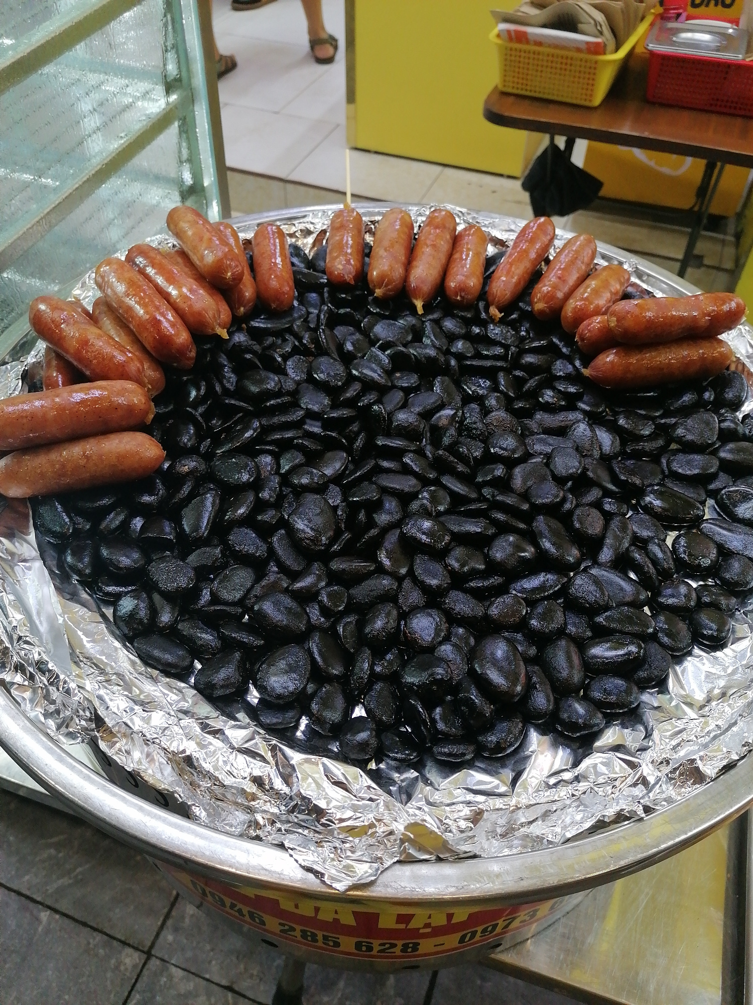 A close-up, eye-level shot depicts a round, metal food vendor's tray lined with crinkled aluminum foil, displaying various items for sale. The tray is largely filled with a dense bed of small, dark, s…read more