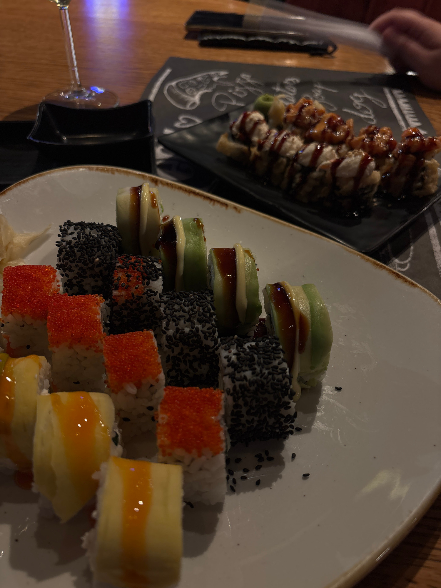 The image depicts two plates of sushi on a wooden table. One plate is black and contains sushi rolls topped with a dark sauce. The other plate is white and has a stack of sushi rolls decorated with av…read more