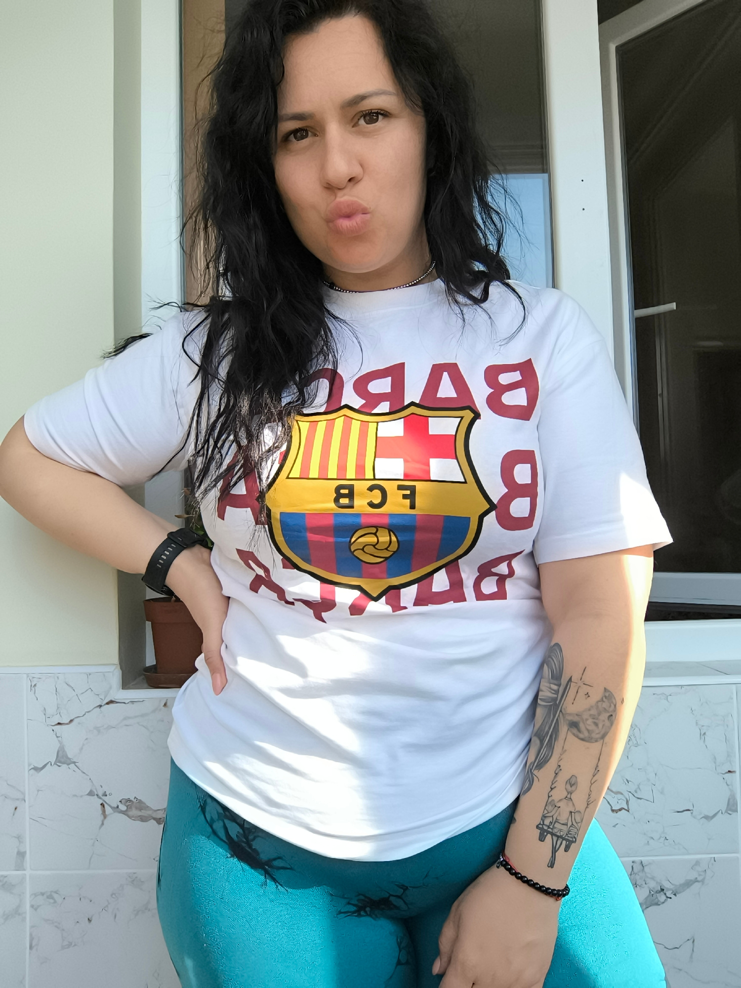 A woman is posing for a picture. She is wearing a white t-shirt with a Barcelona FC logo and blue leggings. She has dark hair and is making a kissing face. She has a tattoo on her right arm and a watc…read more
