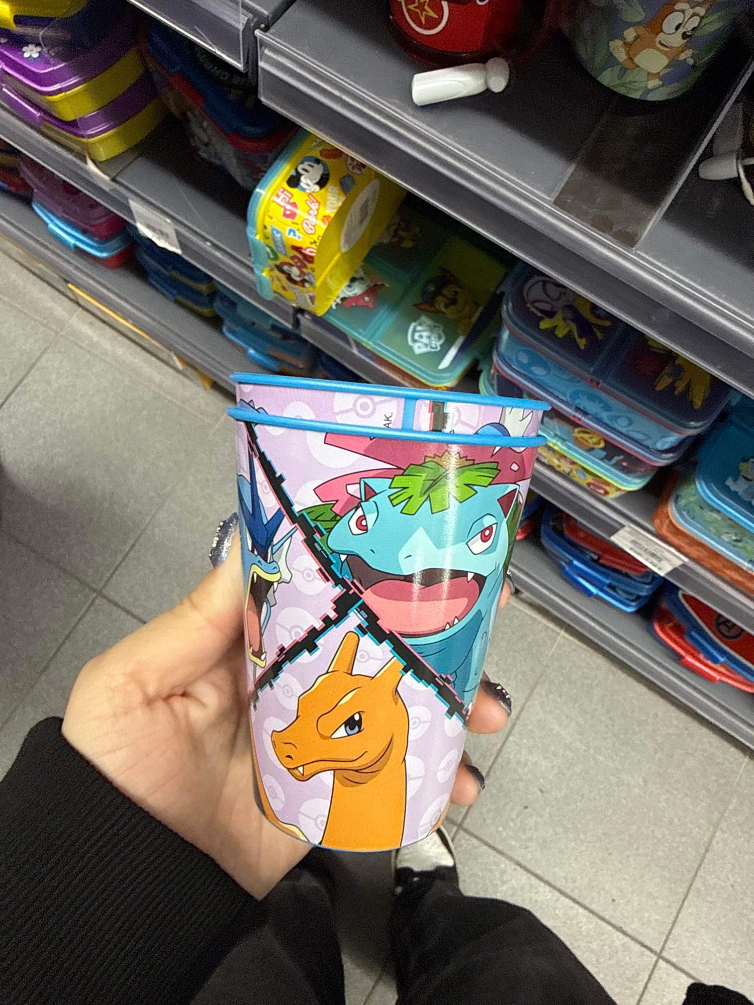 A person stands in a store aisle, holding a cylindrical container with Pokemon characters (Venusaur, Charizard, Blastoise). The aisle is stocked with various lunchboxes. The person is wearing a black…read more