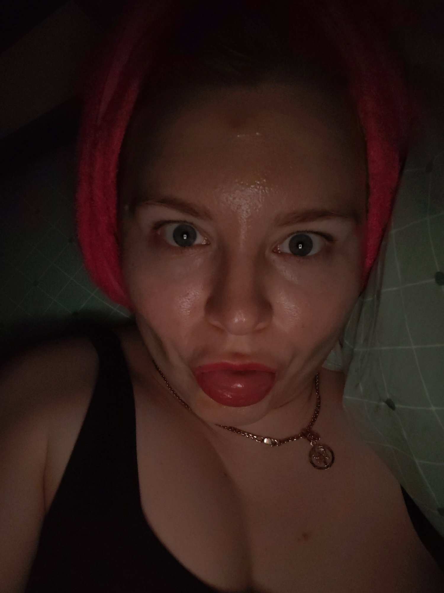 The image is a dimly lit, close-up portrait of a person, likely female, from Izhevsk, Russia, making a playful face. The subject is seen from the chest up, looking directly at the camera with wide, expressive eyes and her tongue sticking out. A vibrant pink or red towel is wrapped around her head, partially obscuring her hair. Her skin appears fair and has a noticeable sheen, particularly across the forehead and cheeks, suggesting moisture or an oily complexion. She is wearing a black top, with a strap visible on her left shoulder. A gold-colored chain necklace with a circular, ornate pendant featuring a raised, intricate design (no discernible text) rests on her chest. The background is dark, with hints of a light green or teal fabric on the right side, showing a faint grid pattern. The lighting is low, illuminating her face from the front and casting some shadows, which highlights the texture of her skin and the towel. The overall impression is one of a lighthearted and mischievous moment, possibly a selfie taken in a casual, indoor setting. | Open Wire