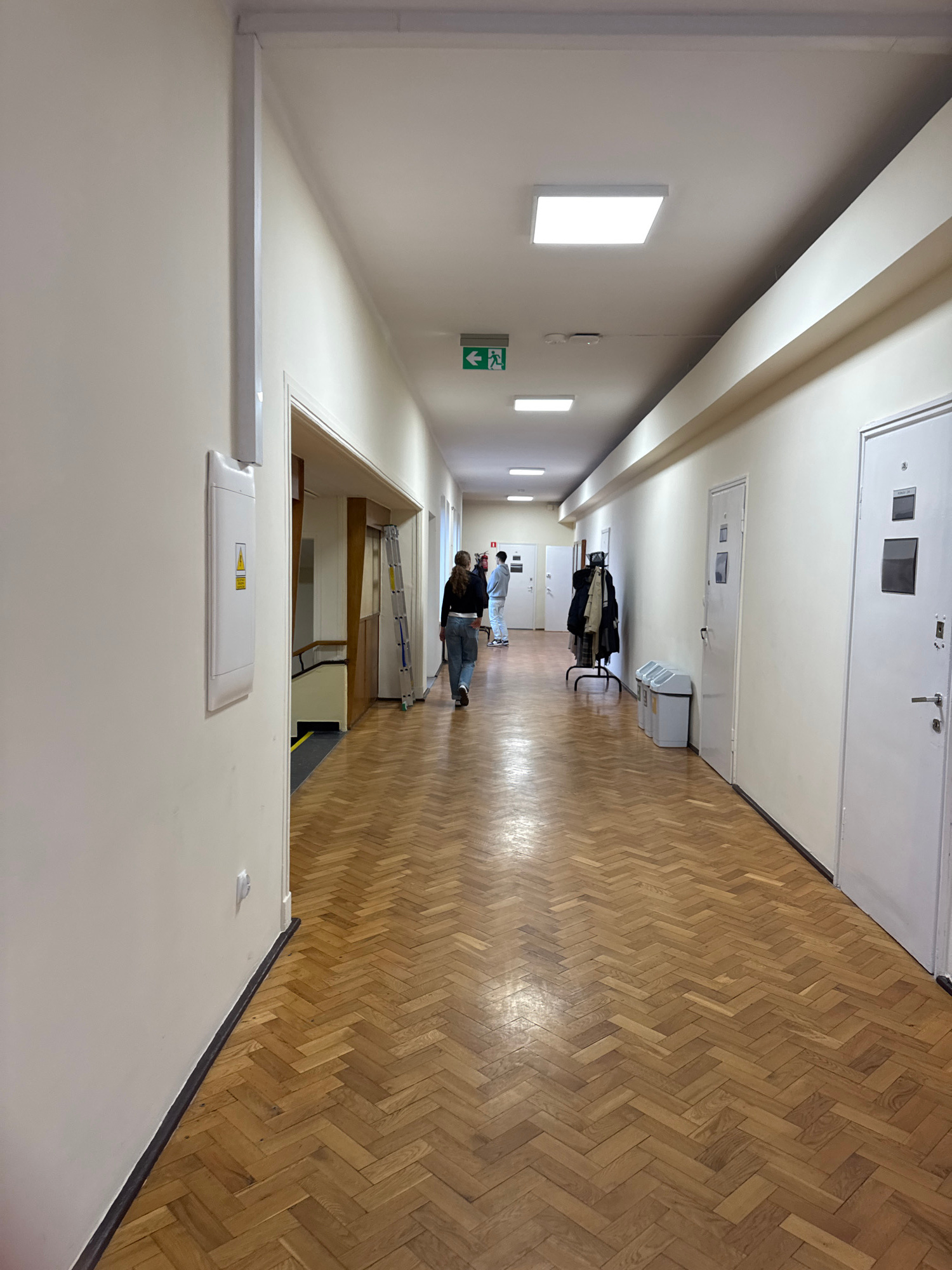 The image depicts a brightly lit hallway with a herringbone pattern wooden floor. The walls are white, and the ceiling features recessed lighting. An exit sign with a green arrow is visible on the lef…read more
