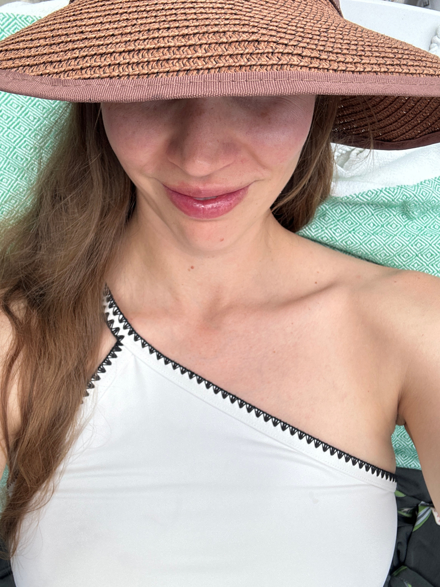 A woman is lying down wearing a white bathing suit with black trim and a brown straw hat. She is lying on a green and white patterned towel. The photo was taken in Fethiye, Turkey.