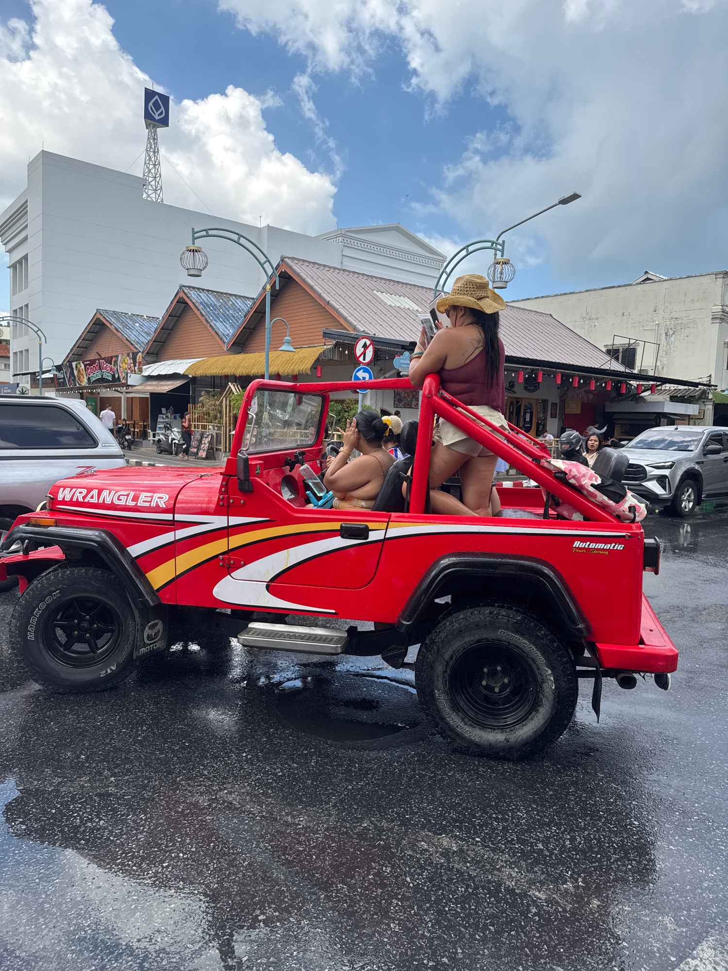 The image captures a red Jeep Wrangler, heavily modified with a roll cage and exterior graphics, parked on a wet city street in Phuket City Municipality, Thailand. The pavement reflects the sky and su…read more