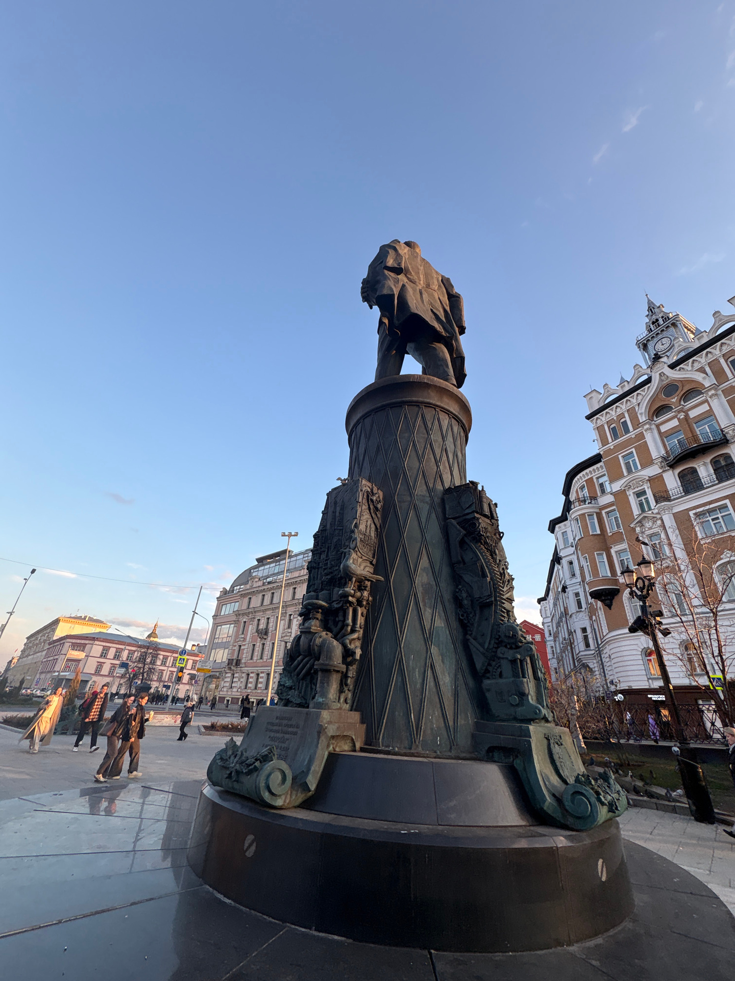 The image depicts a monument in Moscow, Russia, against a backdrop of buildings and a blue sky. The monument features a statue of a person atop a decorated pedestal. The pedestal exhibits detailed car…read more